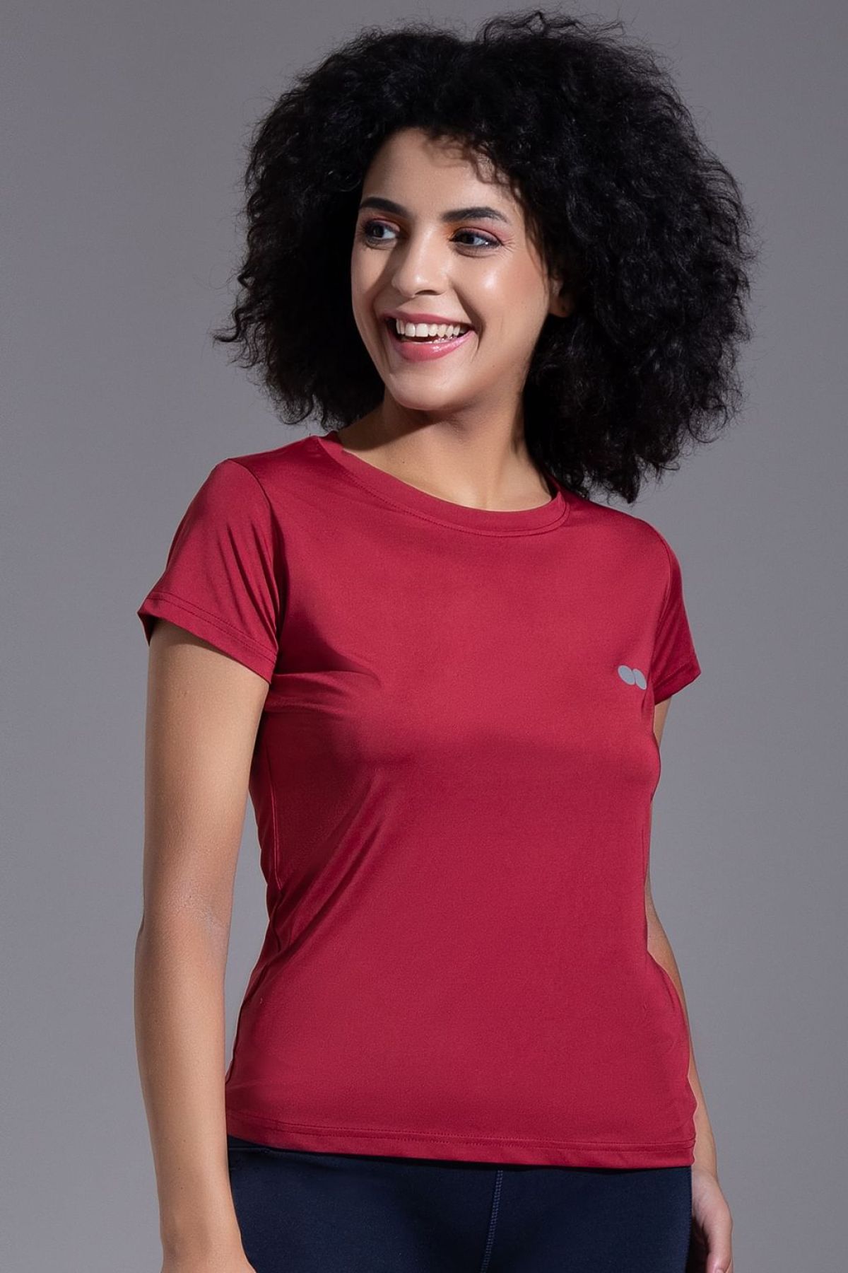 - Maroon activewear T-shirt crafted with smooth polyester and spandex fabric.