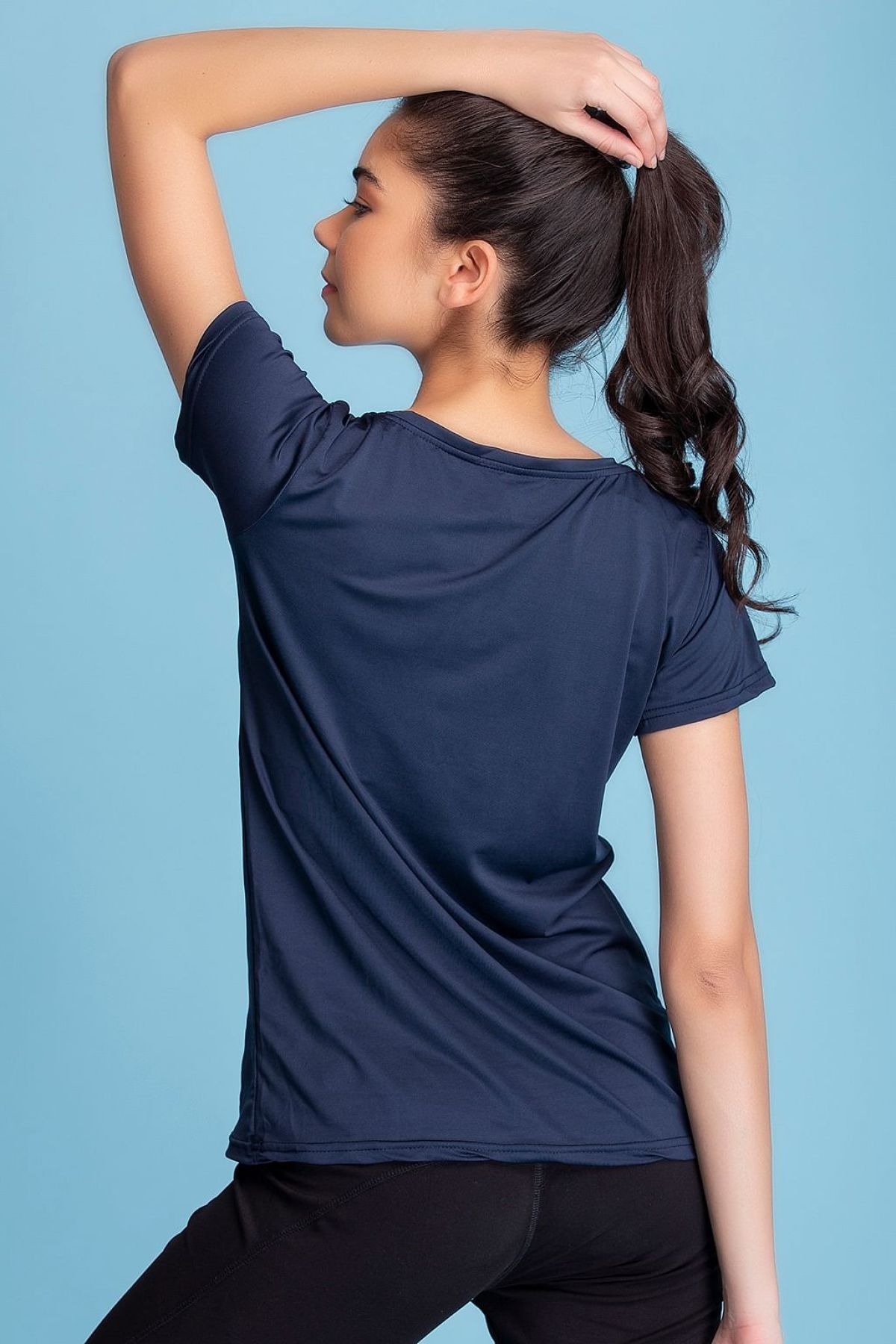 - Navy activewear T-shirt crafted with smooth polyester and spandex fabric.