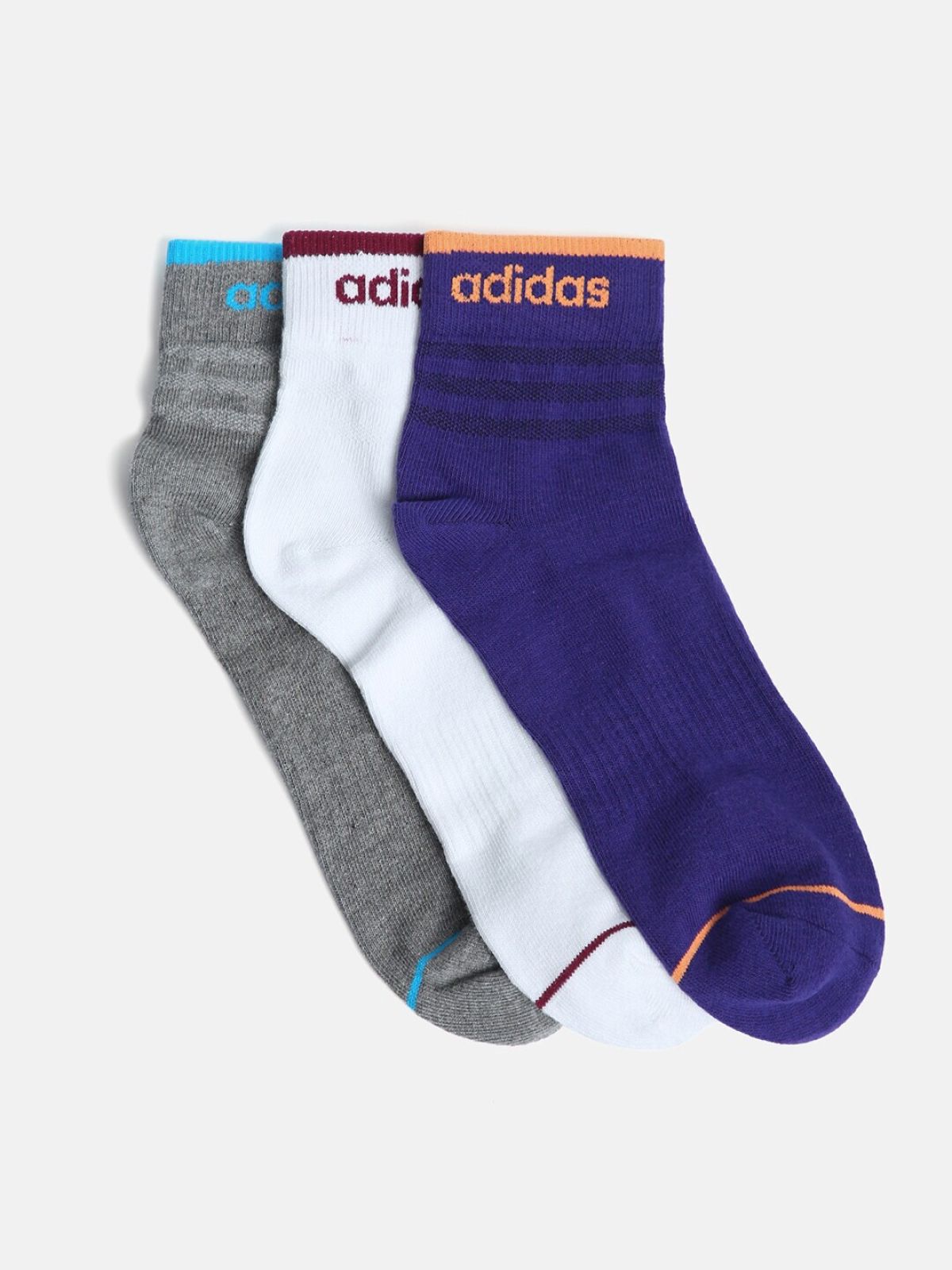 Pack of 3 Ankle Length-Socks, in blue, grey and white, Each has a ribbed mouth and a flat toe seam