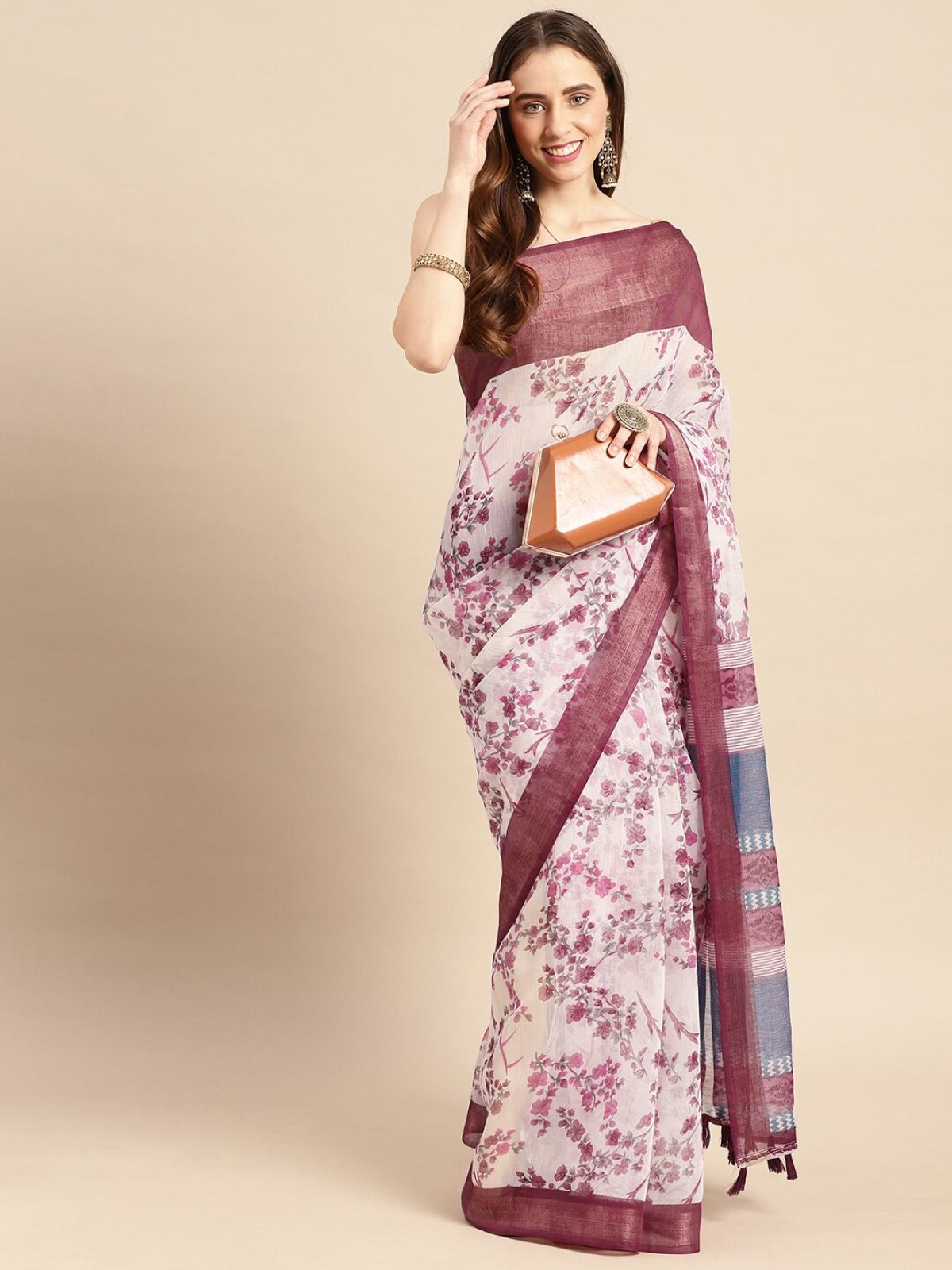 - Floral printed saree with solid border