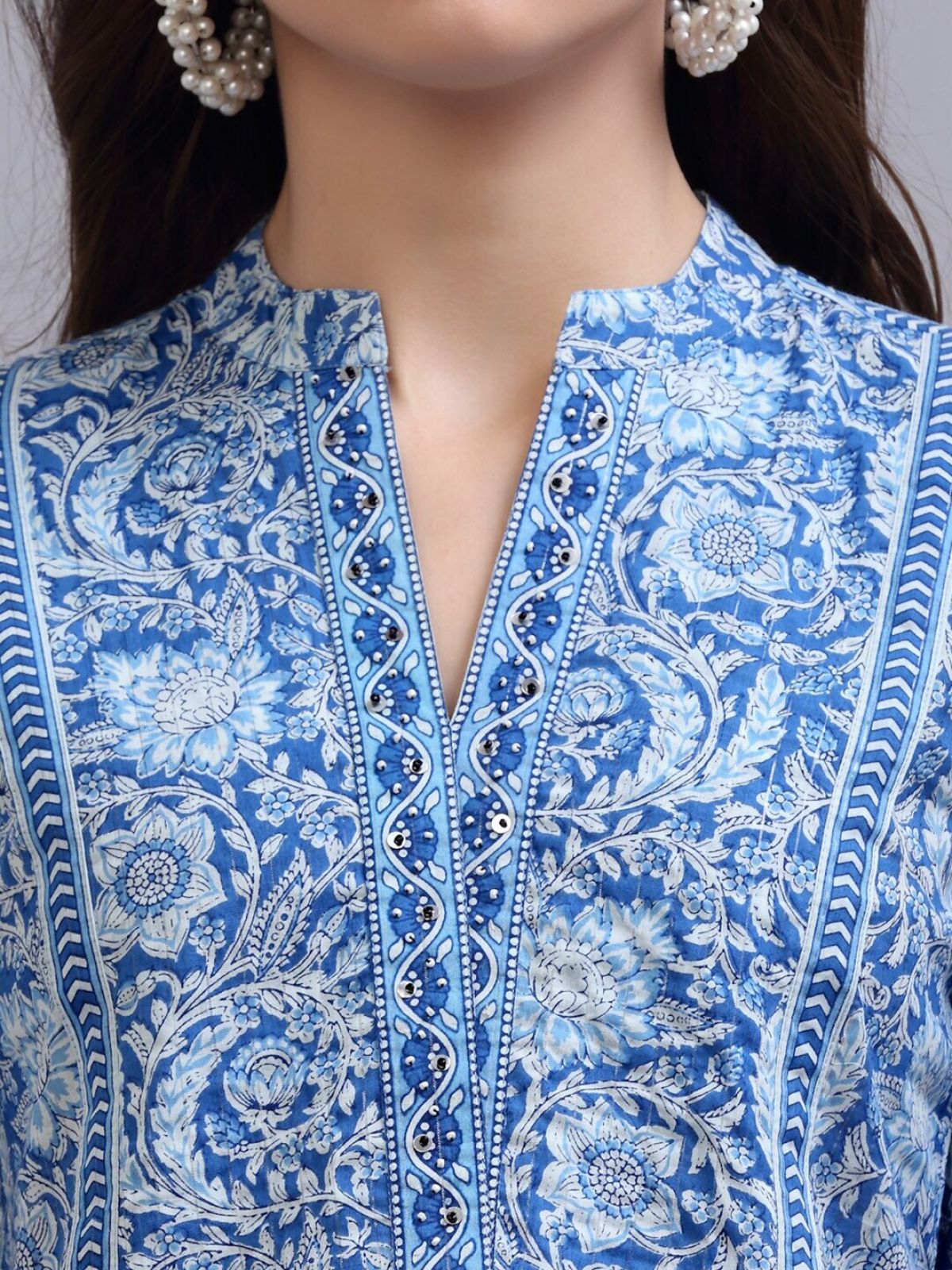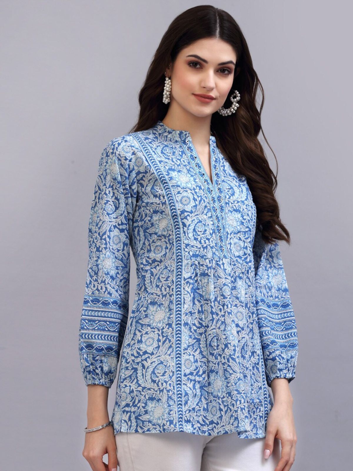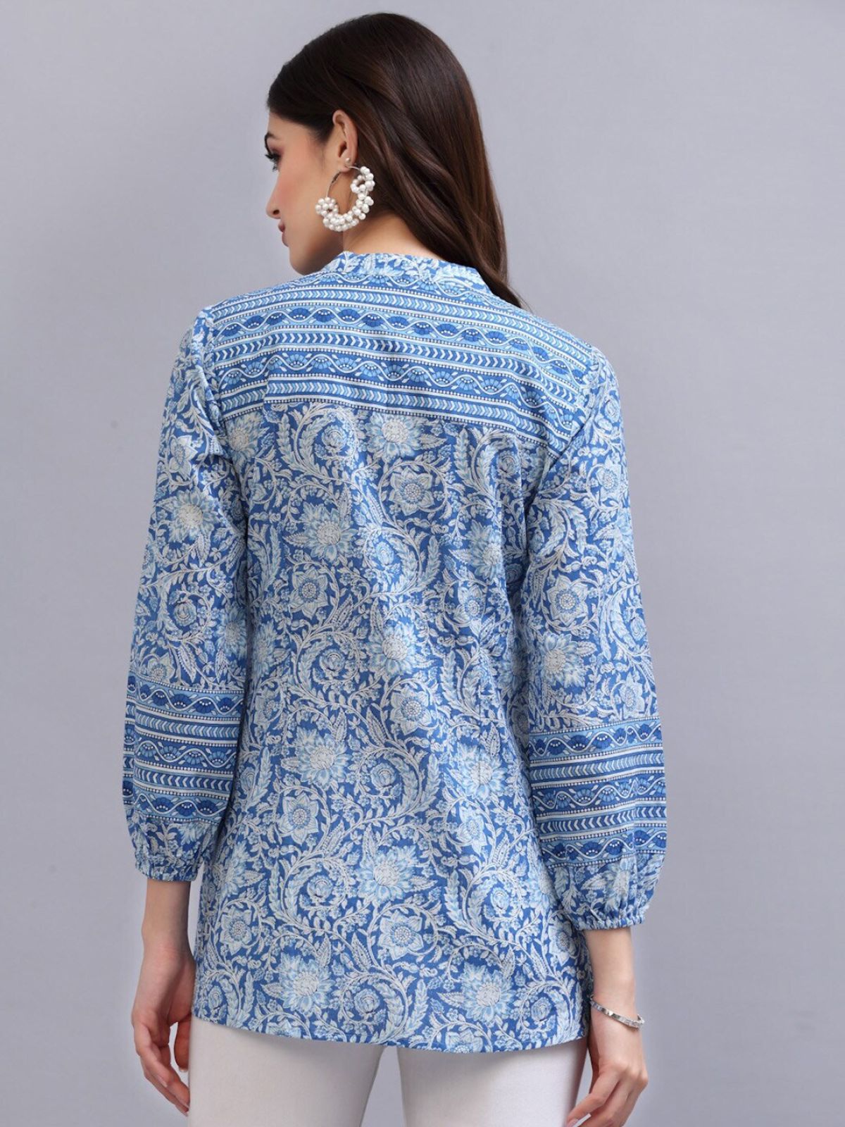 Blue Print Mandarin Collar Empire Pure Cotton Longline Top (QOMN)