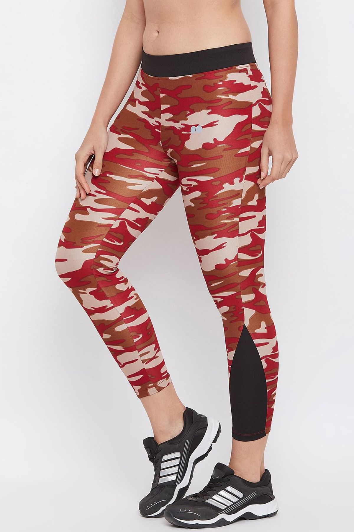 - Maroon camouflage print ankle-length tights crafted with soft moisture-wicking polyamide fabric.