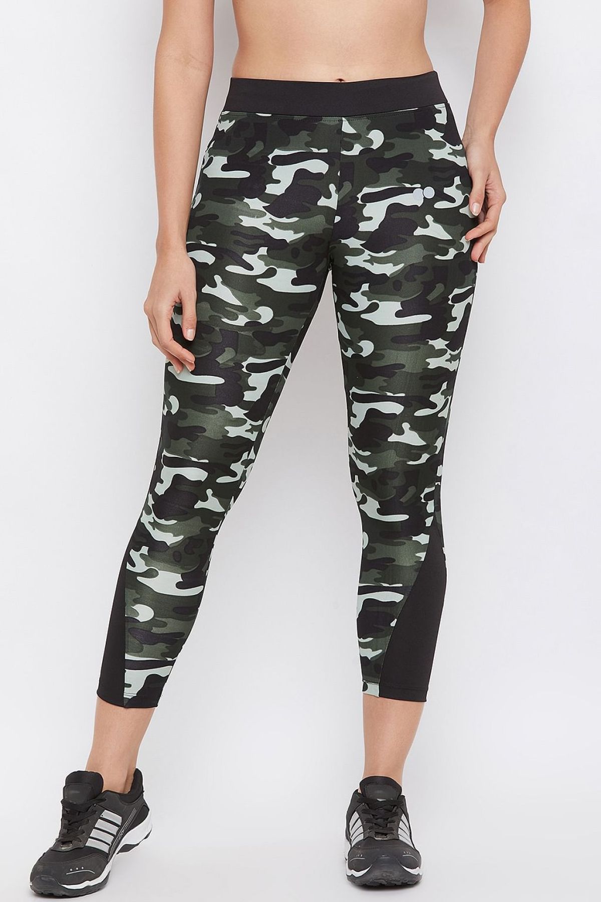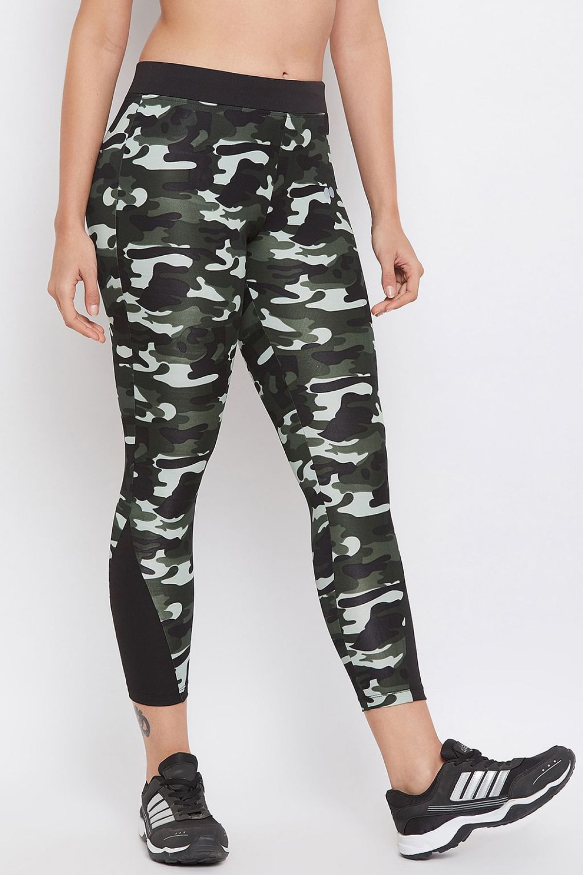 - Olive green camouflage print ankle-length tights crafted with soft moisture-wicking polyamide fabric.