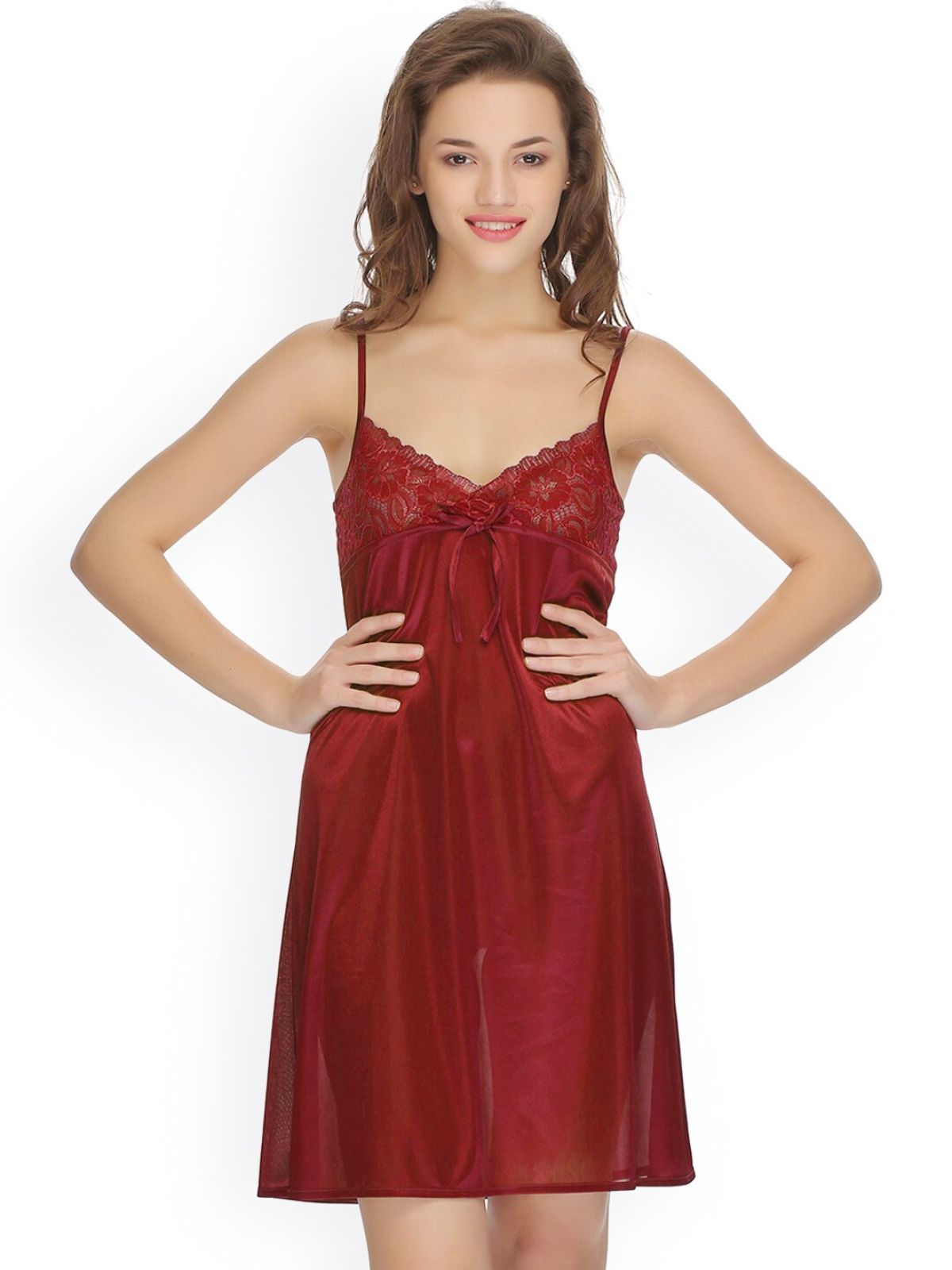 - Maroon woven nightdress, has adjustable shoulder straps, elasticated detail on the back