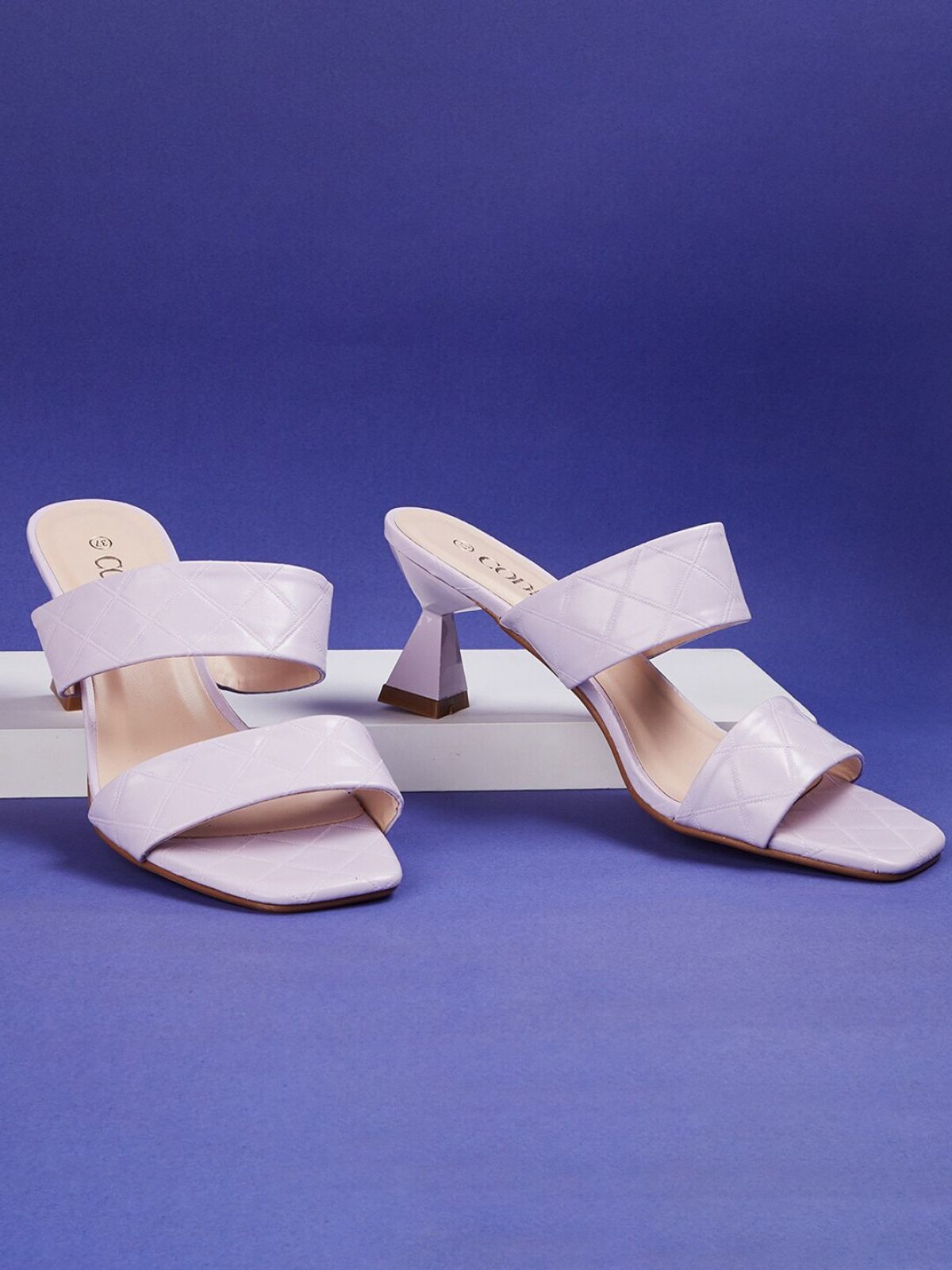 - A pair of lavender textured open toe block heels,has regular ankle and open back