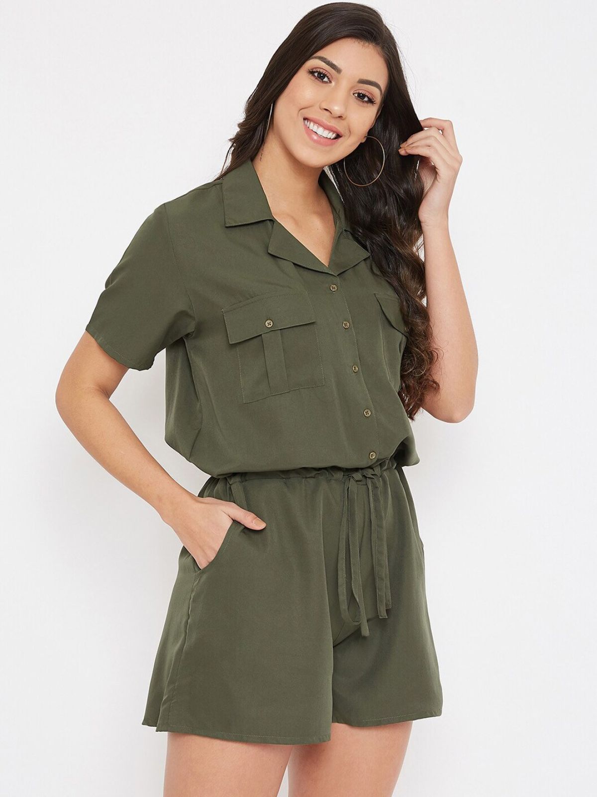 Olive Green solid playsuit, has a shirt collar, short sleeves