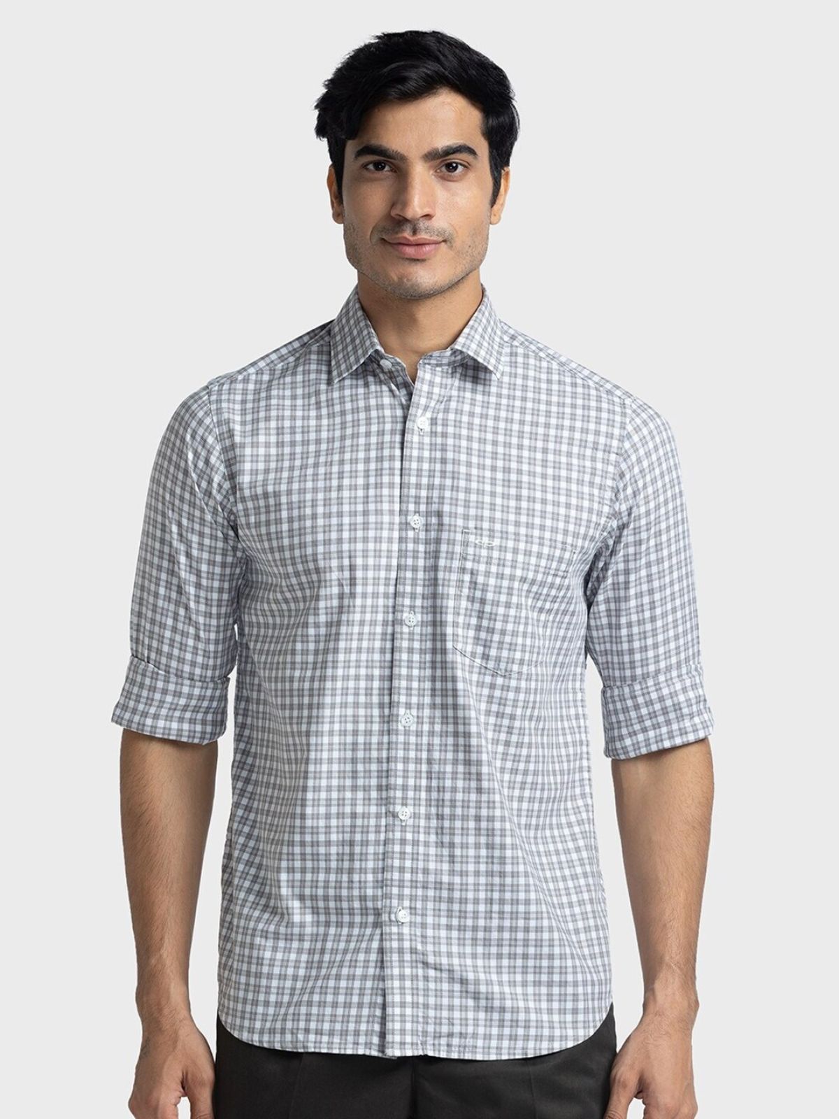 Grey & white micro checks checked opaque casual shirt ,has a spread collar, button placket, 1 pocket, long regular sleeves, curved hem