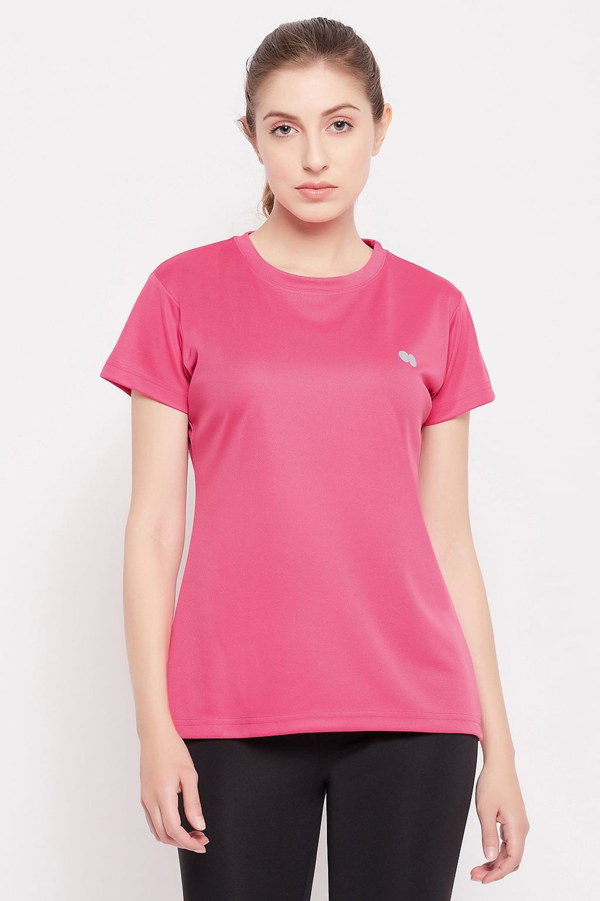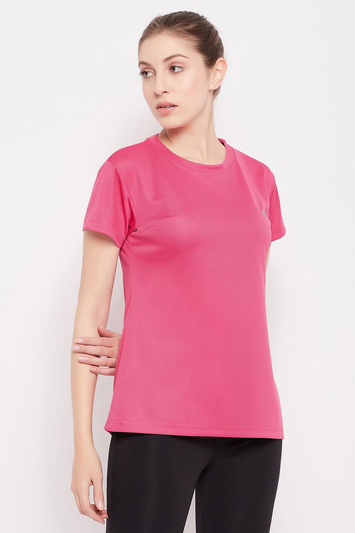 - Blush pink comfort fit sports T-shirt crafted with poly spandex fabric that moves along with your movement.