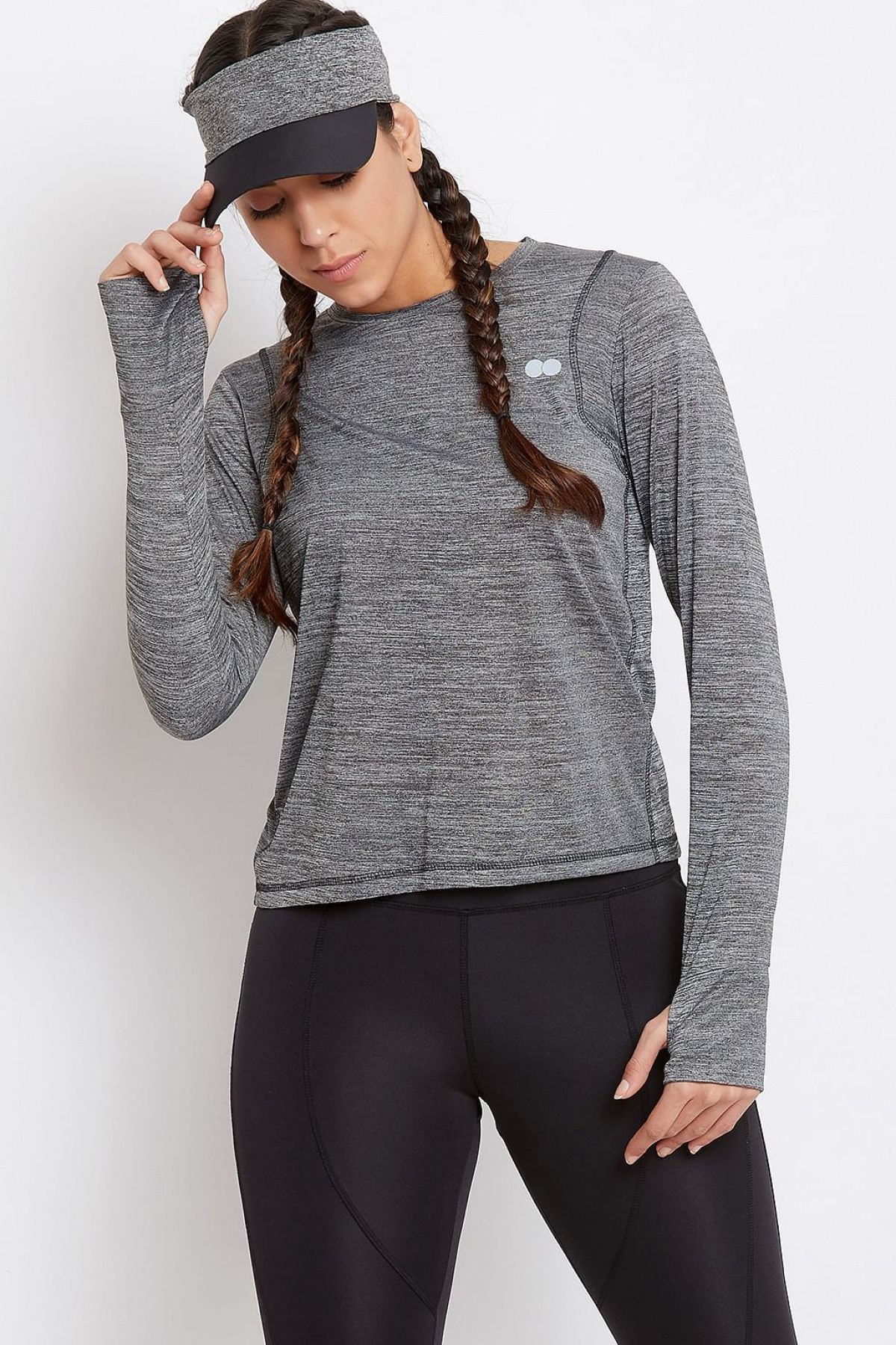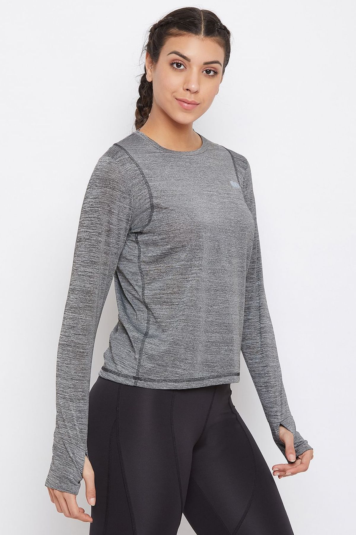 - Grey melange activewear T-shirt crafted with smooth polyester fabric that wicks away the sweat.