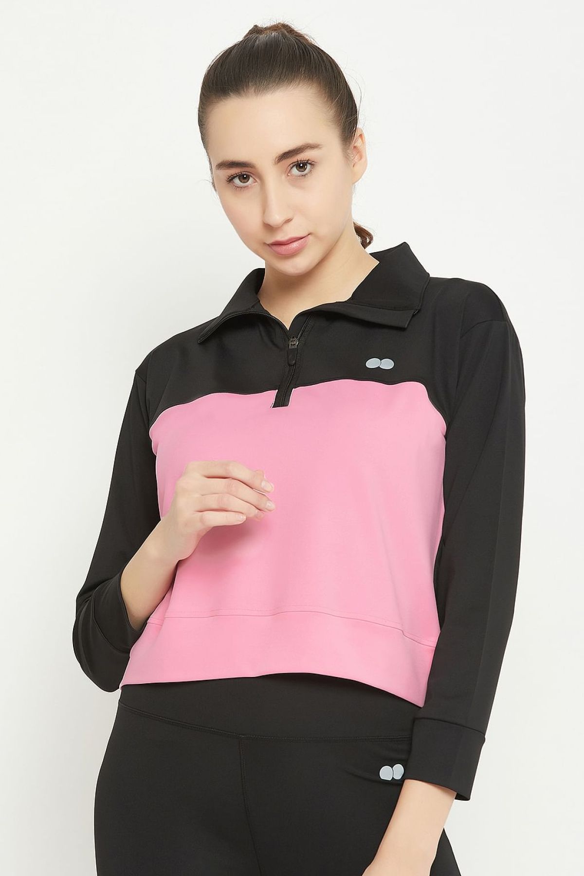 Comfort-Fit Active Zipper Top in Black with Pink Panels