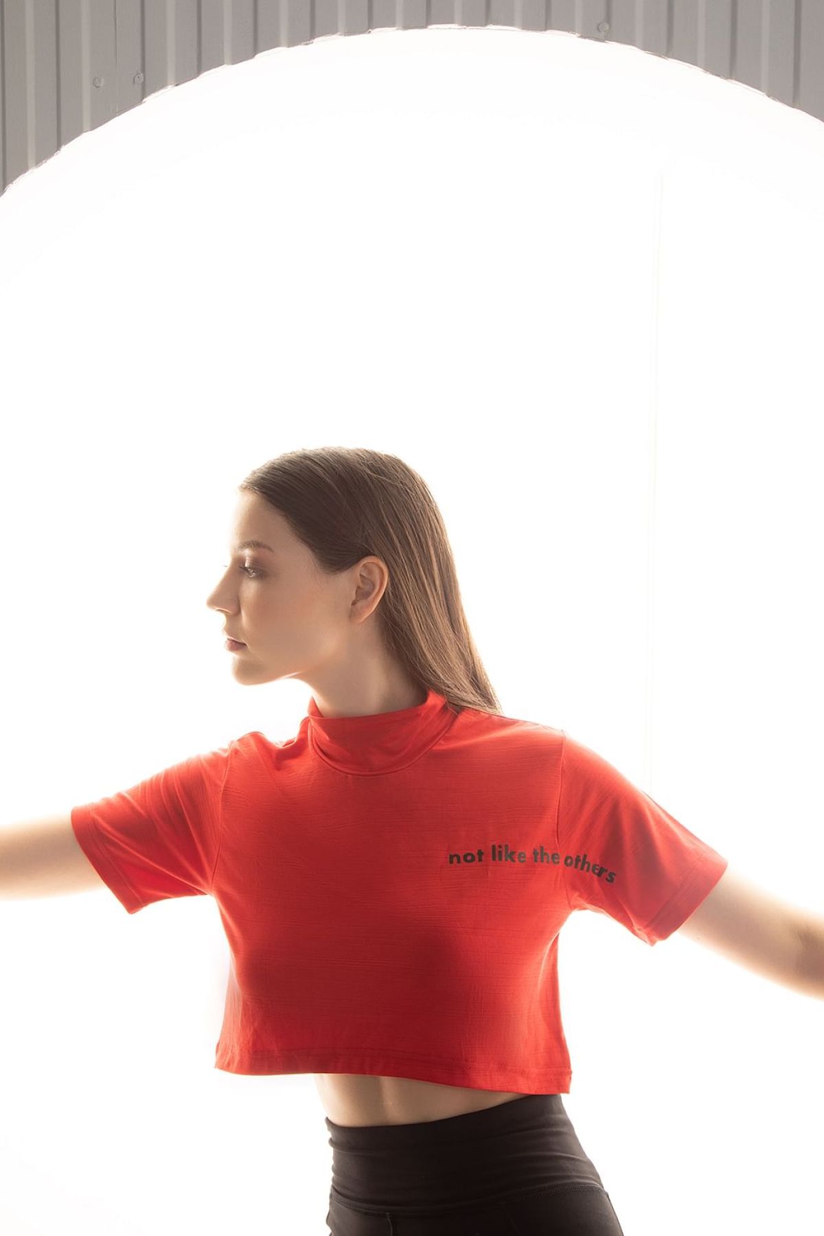 *Check the latest price and availability on the official store.Comfort Fit Text Print Turtleneck Active Crop Top in Red