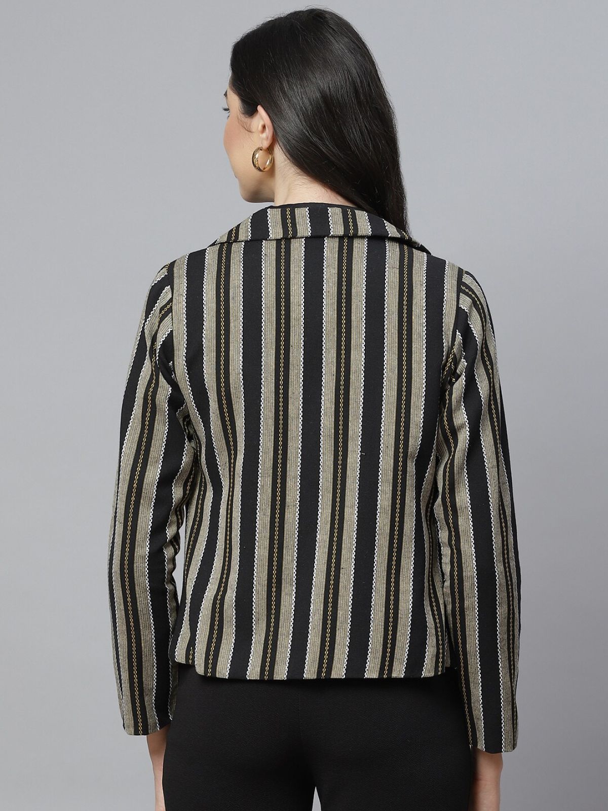 Black& Beige striped blazer, has a notched lapel, long sleeves, single-breasted with button closure, two pockets and a double-vented back hem