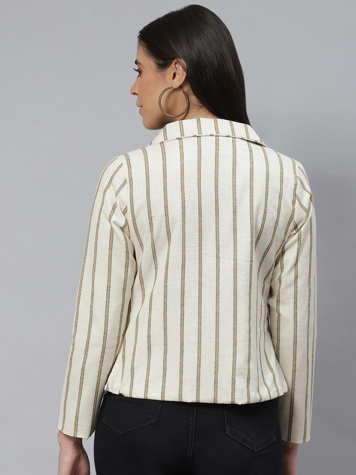 Off-white and olive green striped open front blazer, has a notched lapel collar, 2 pockets, and long sleeves
