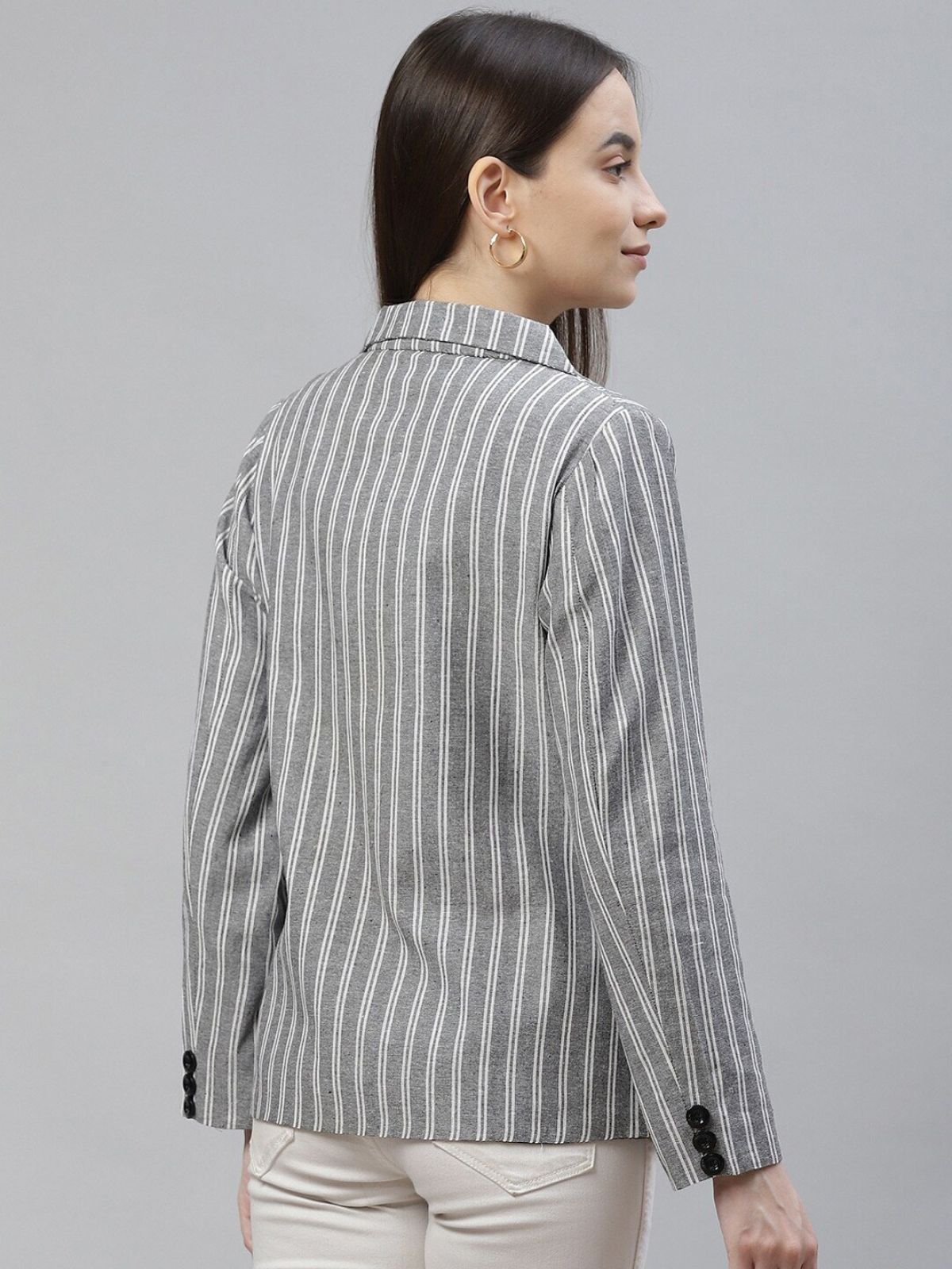 Cottinfab Women Grey & White Striped Pure Cotton Single-Breasted Casual Blazer