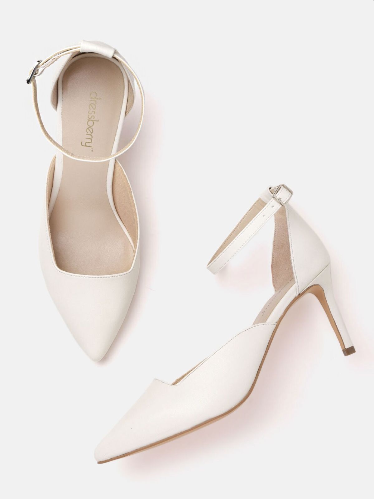 - A pair of white pointed toe pumps, has mid-top styling, ankle loop with buckle detail