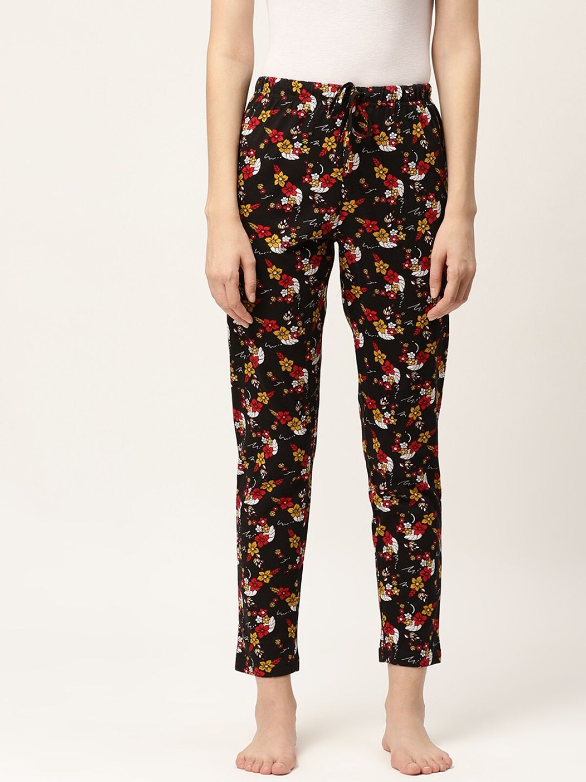 Black, red and yellow floral printed lounge pants, has an elasticated waistband with drawstring closure, two pockets