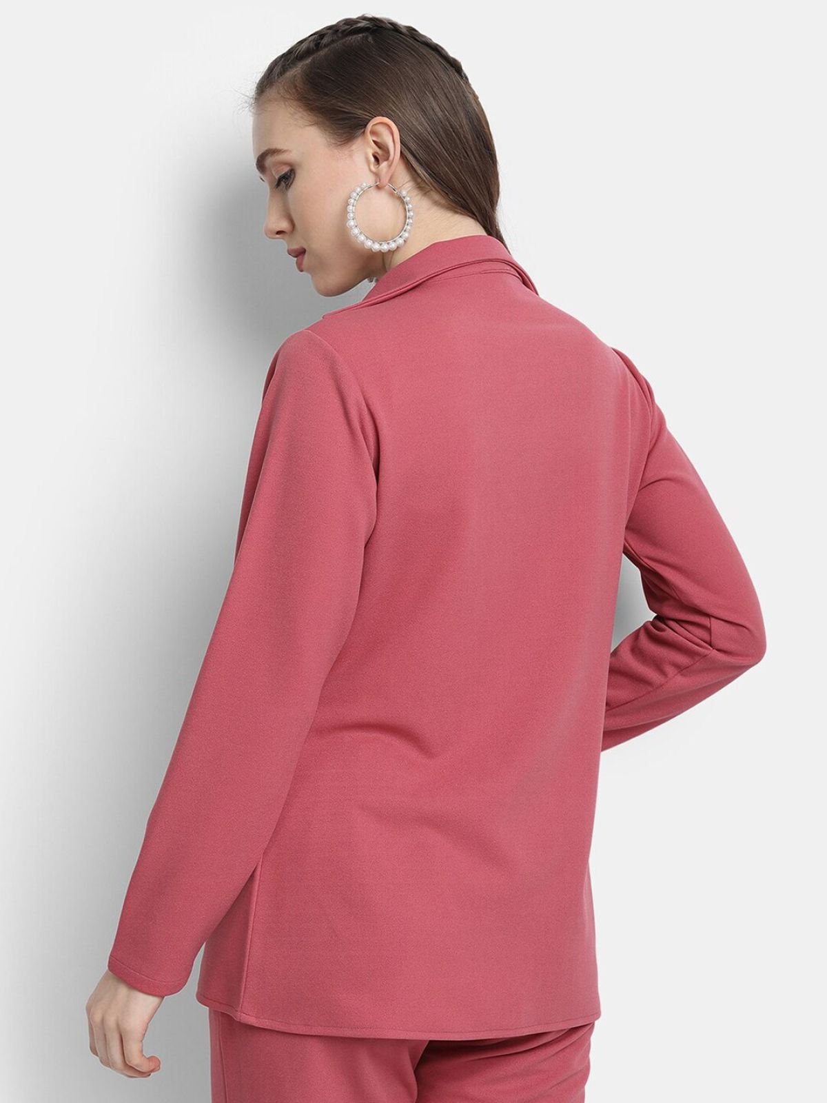 Pink solid regular-fit formal blazer, has a notched lapel, single-breasted with double button closure, long sleeves, single vented back hem, and two pockets
