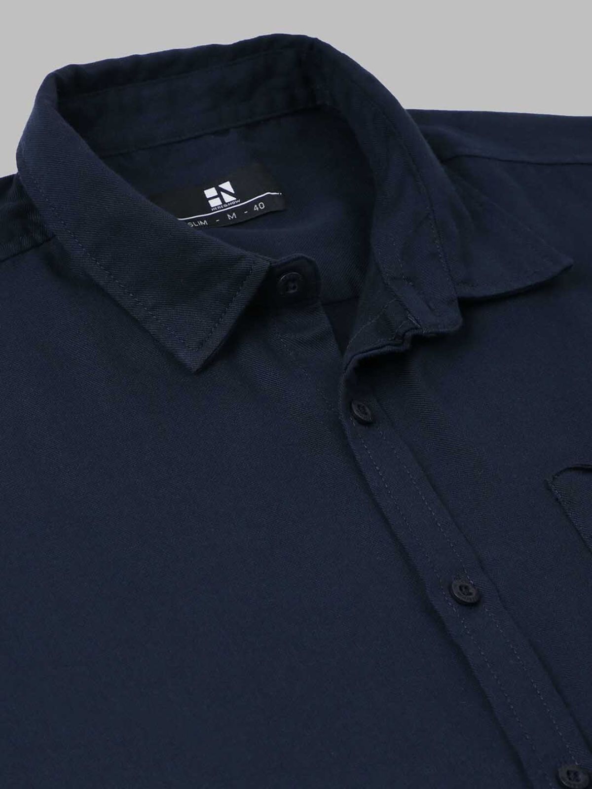 Navy blue solid opaque Casual shirt ,has a spread collar, button placket, na pocket, long regular sleeves, curved hem