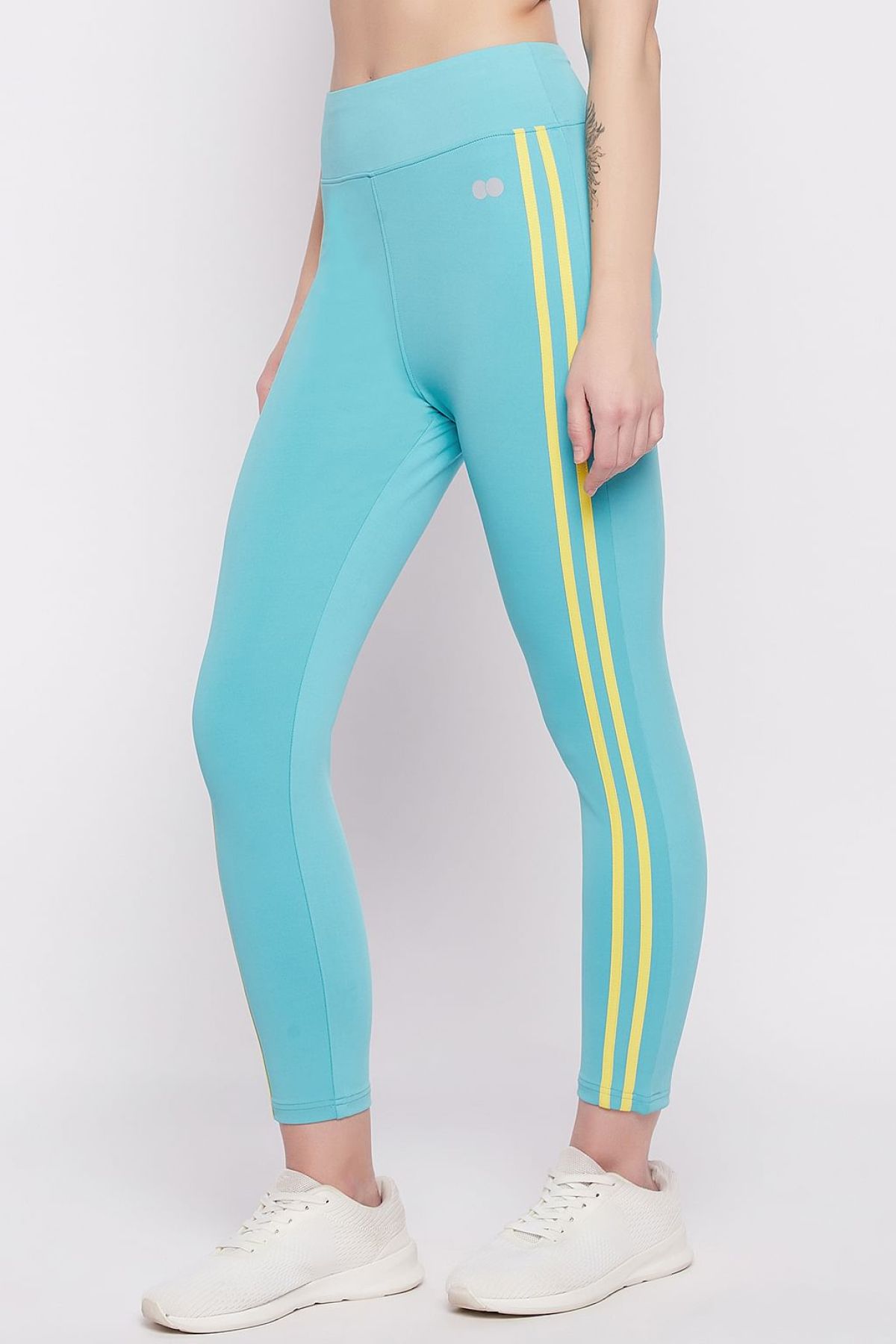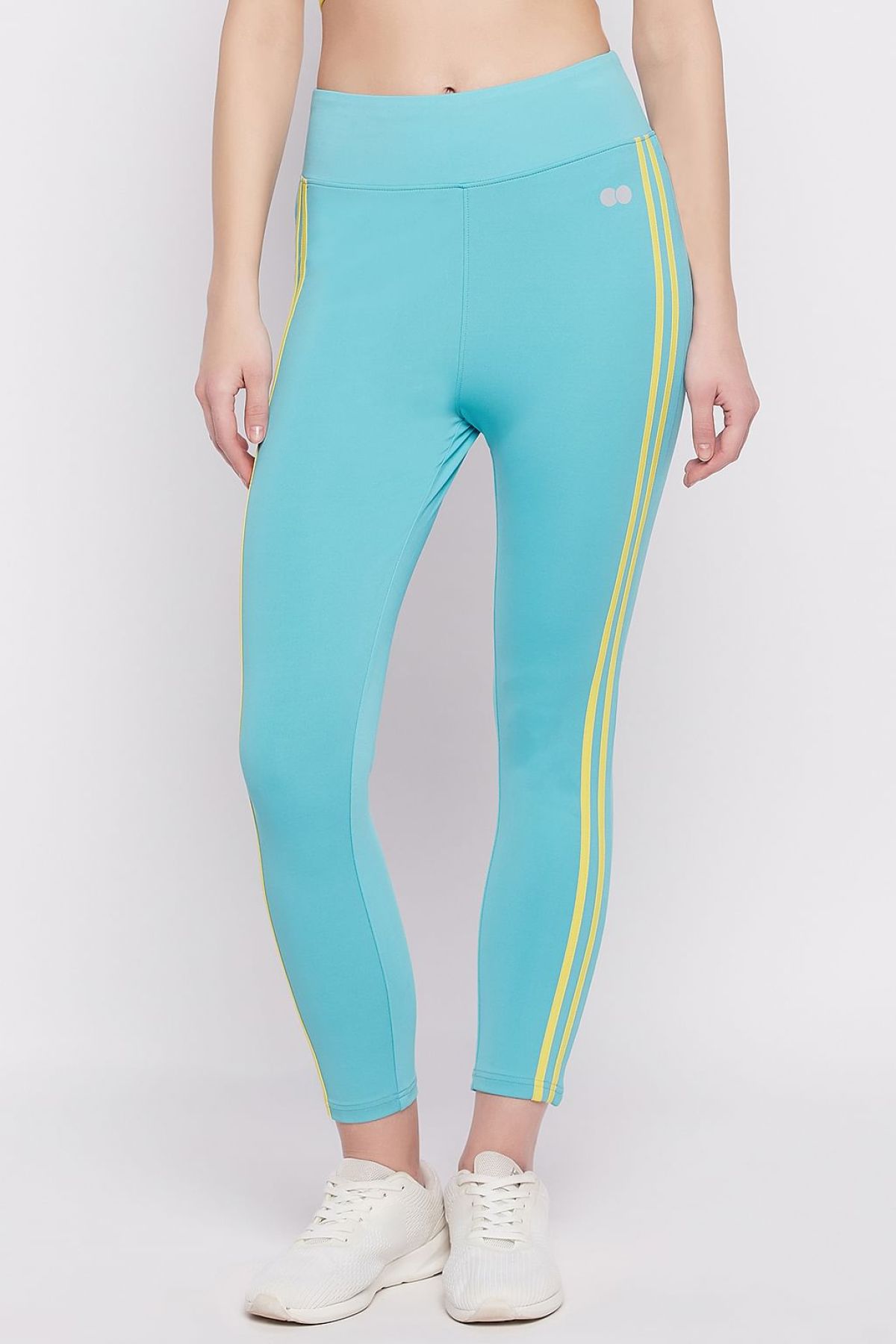 - Sky blue high waist active tights crafted with soft poly-spandex fabric.