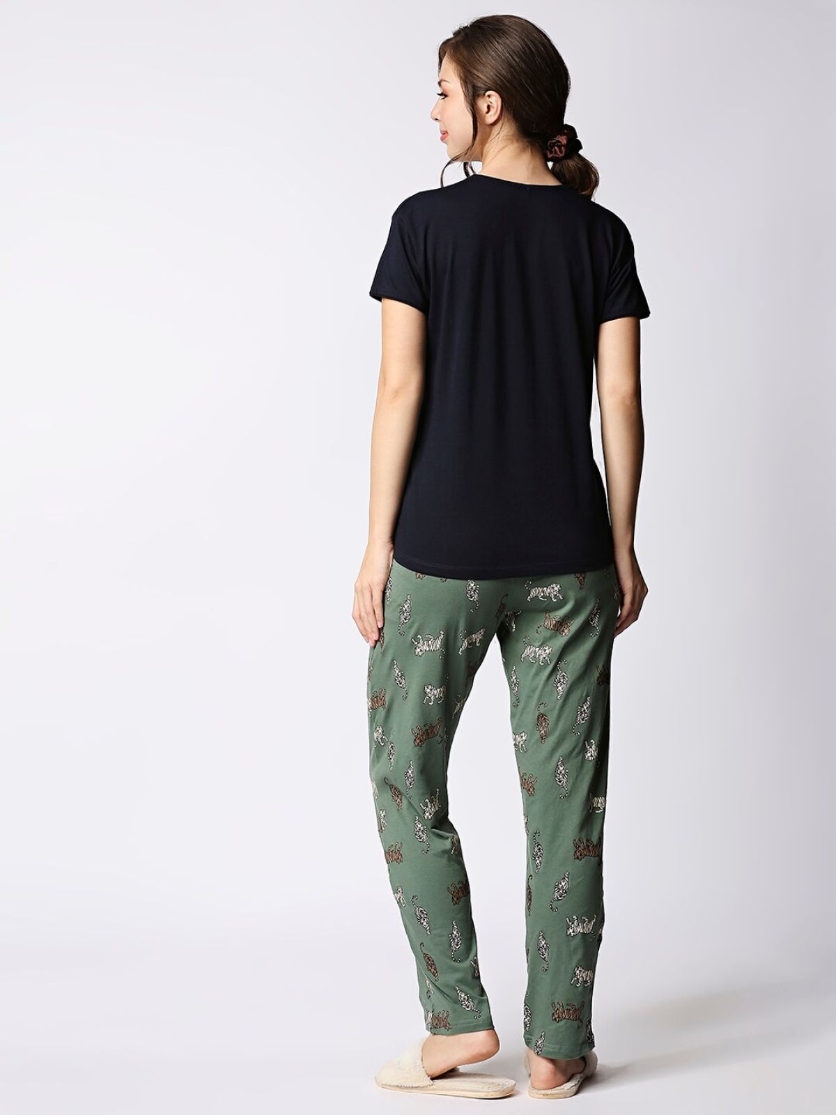 - Olive Tiger Printed pyjamas, has drawstring closure, one pocket