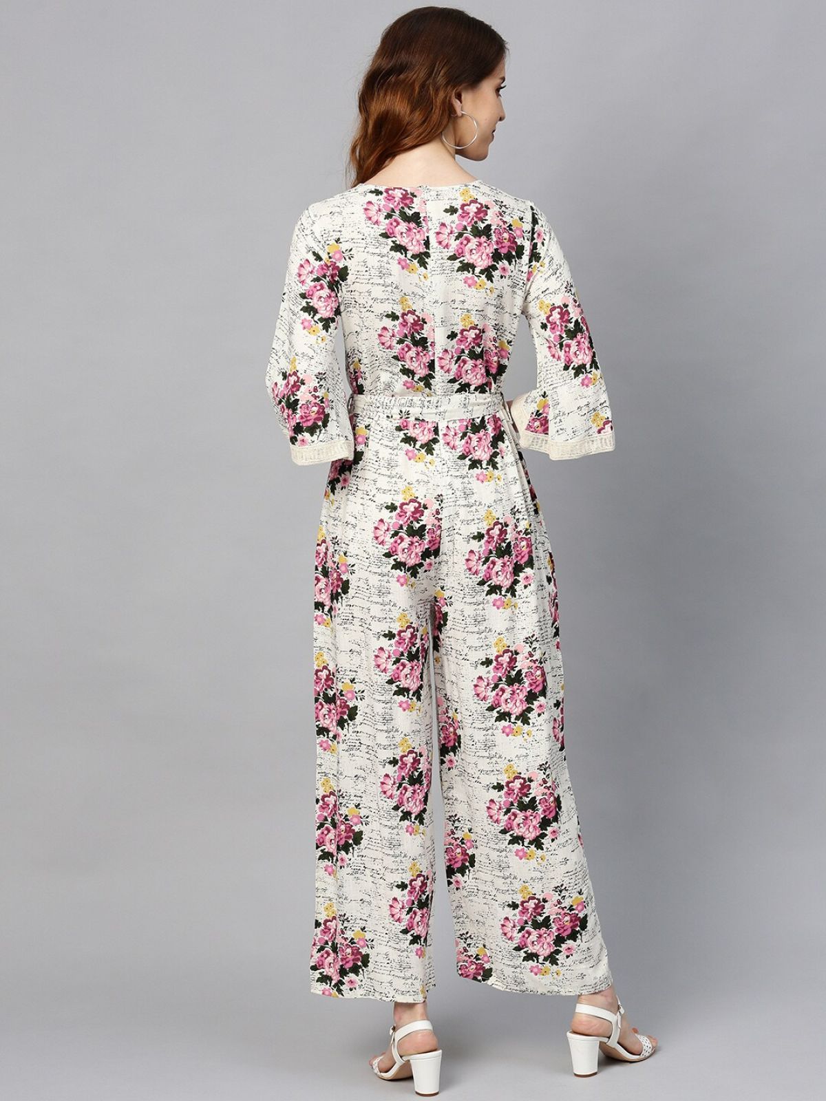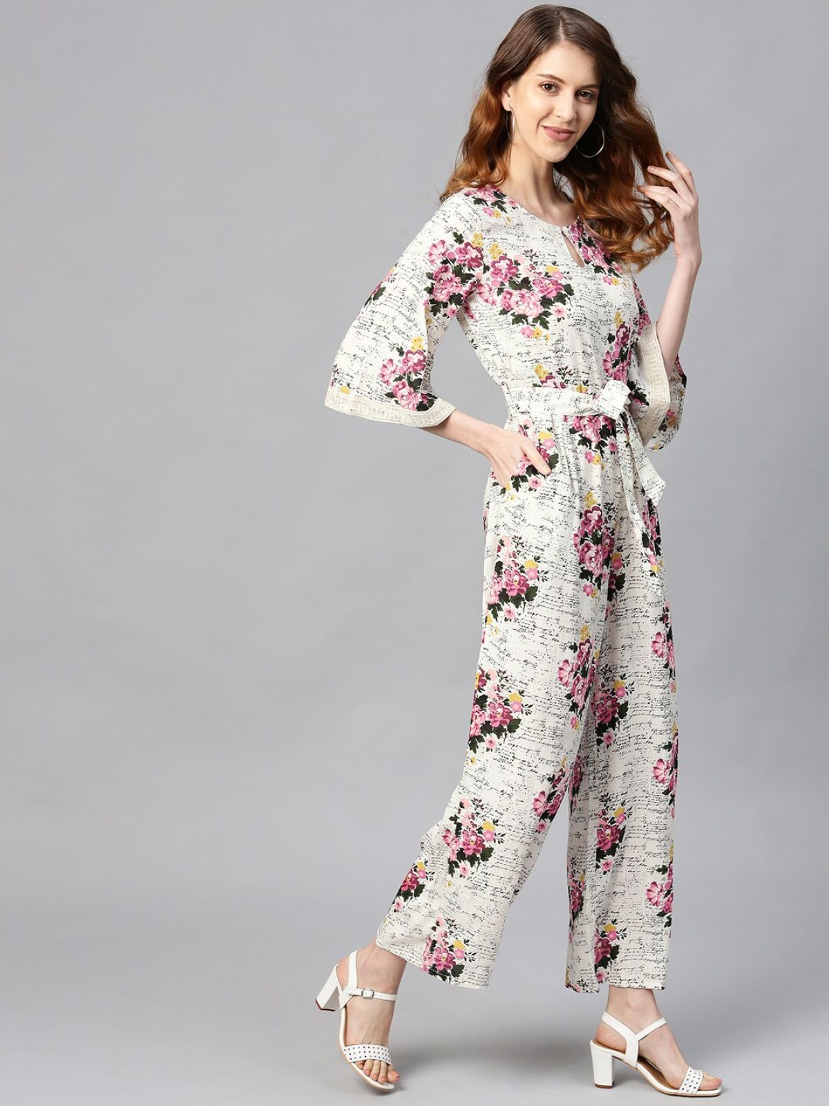 - Off-White and pink floral print basic jumpsuit, has a keyhole neck, three-quarter sleeves, 2 pockets, concealed zip closure