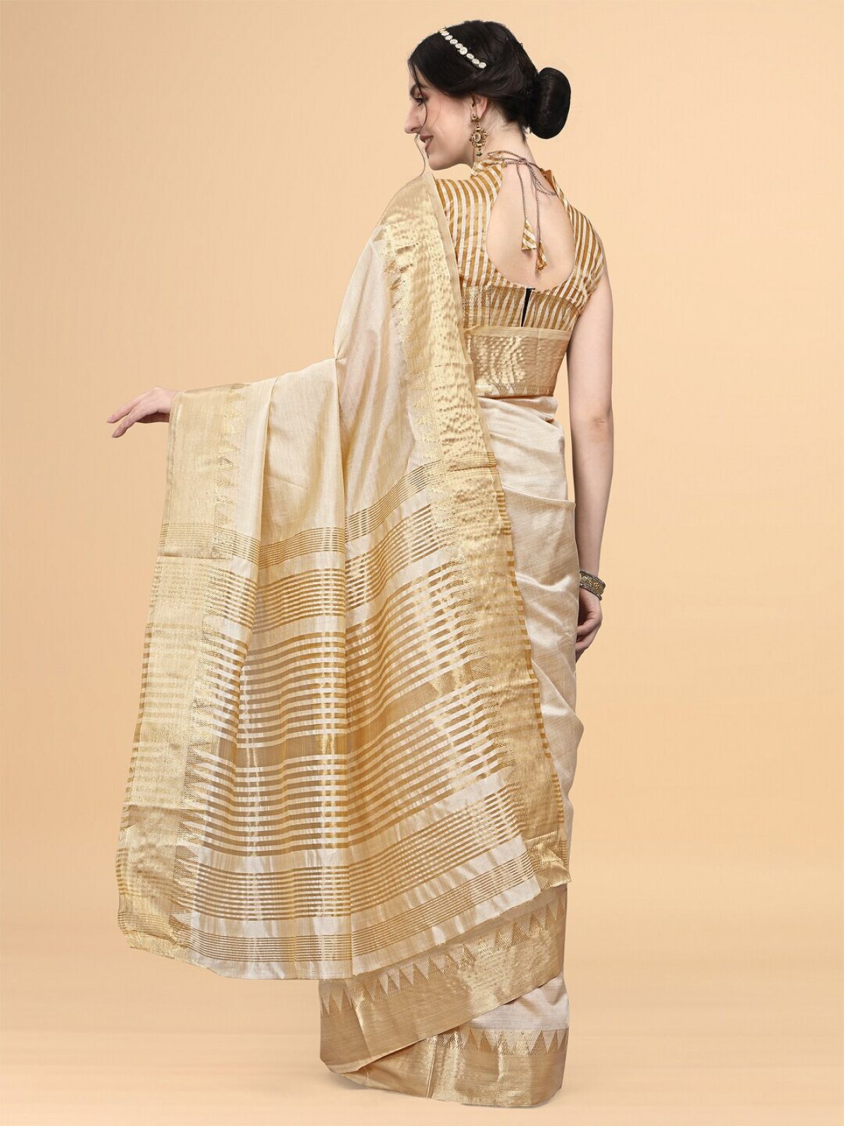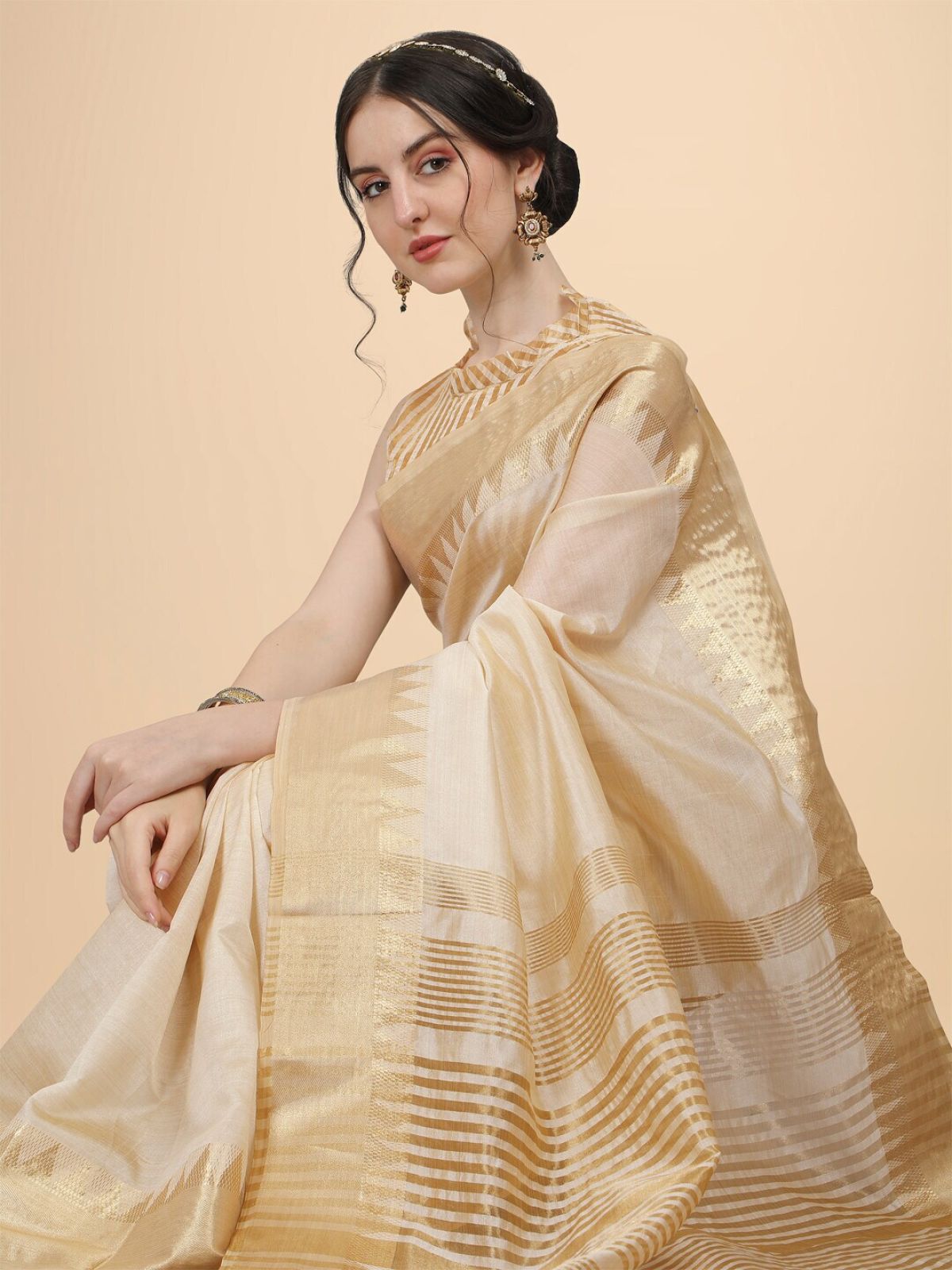 - Cream-coloured and gold-toned banarasi saree