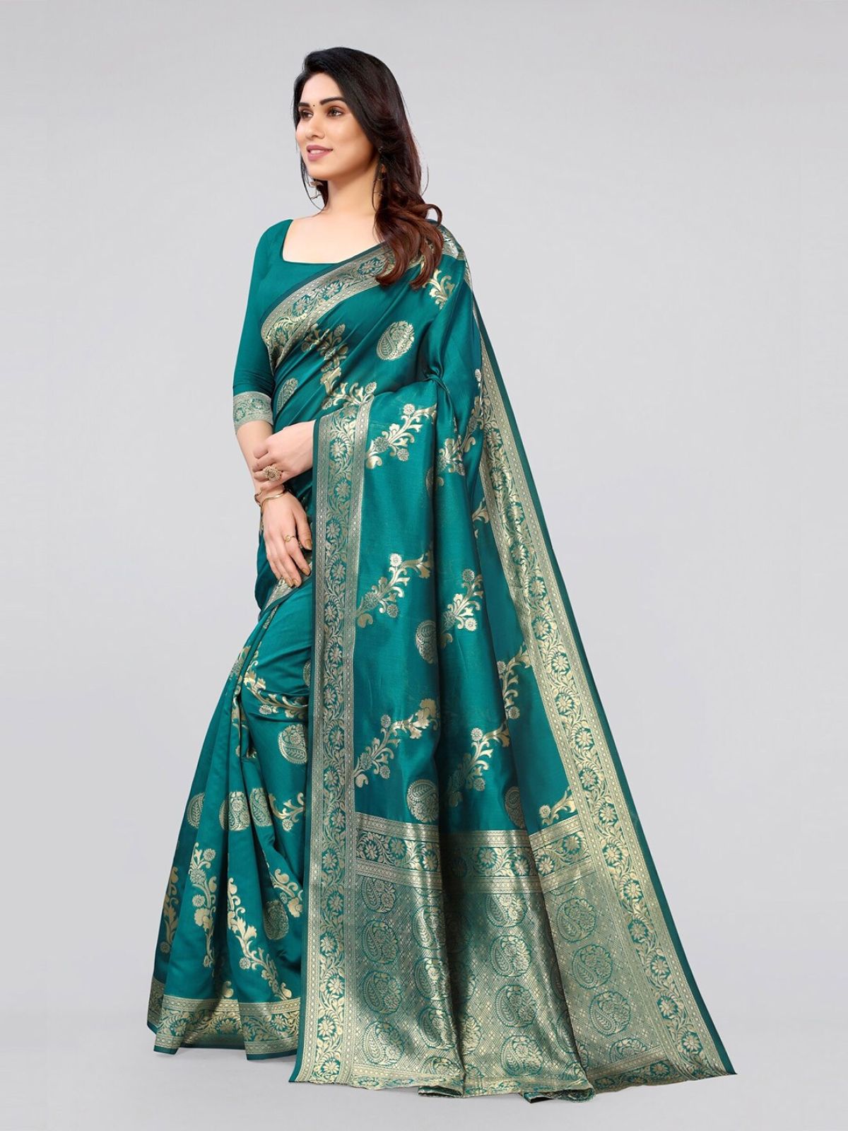 - Green and gold-toned banarasi saree