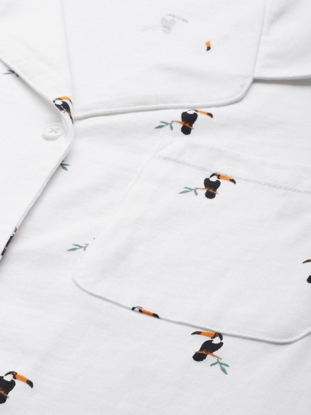 - White and black toucan printed shirt, has a lapel collar, short sleeves and full button placket closure and 1 chest pocket
