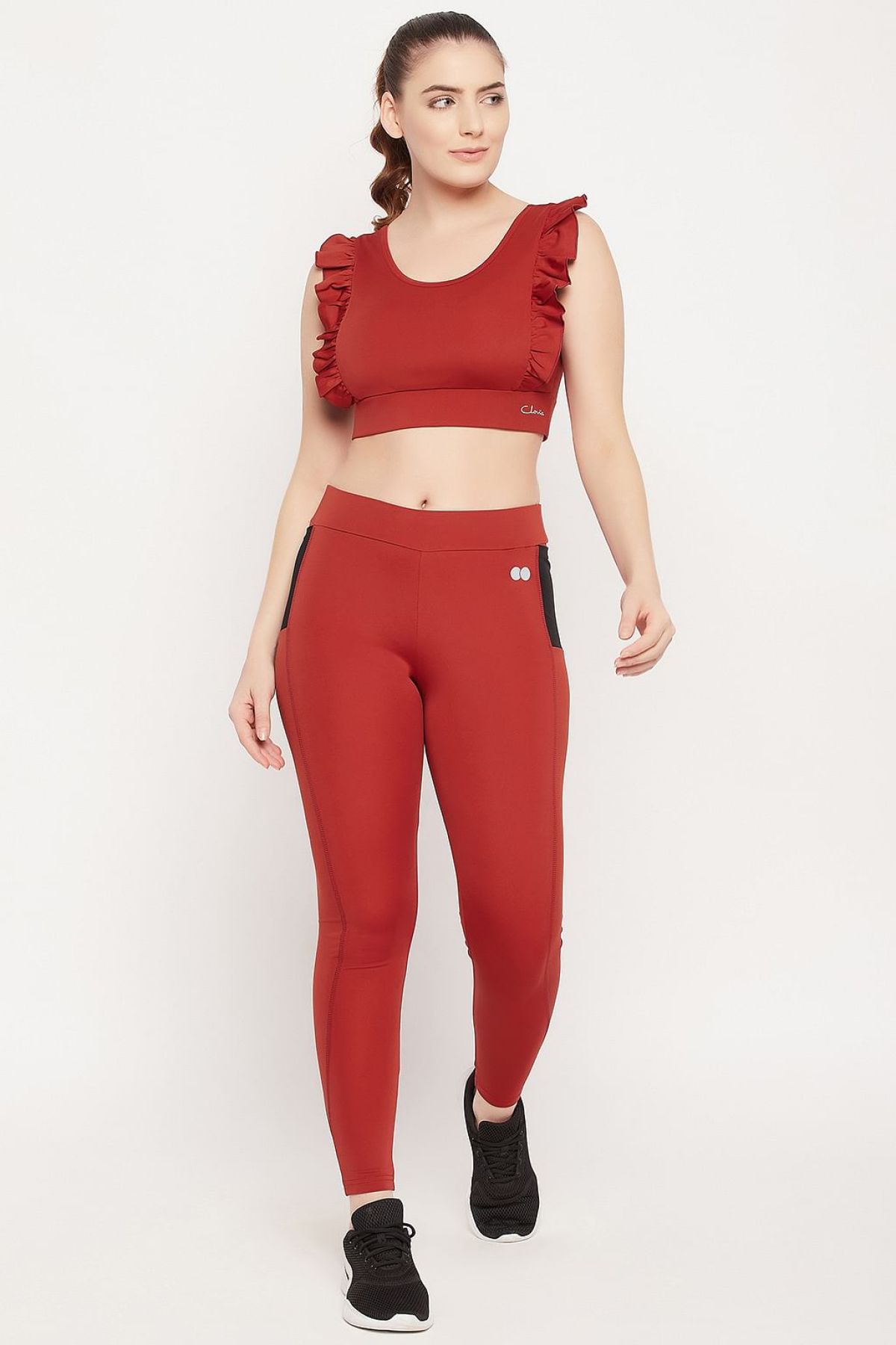 - Red sports bra & snug fit high rise active tights set crafted with soft moisture-wicking polyester spandex fabric.