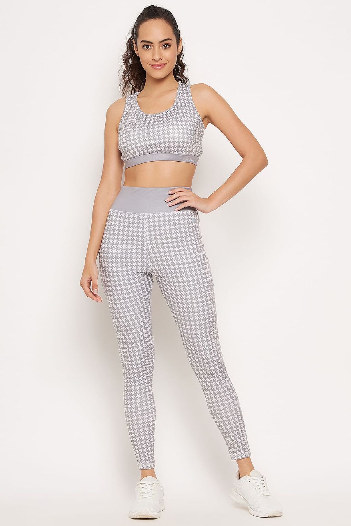 Medium Impact Padded Sports Bra & Snug Fit High Rise Tights in Grey with Houndstooth Print