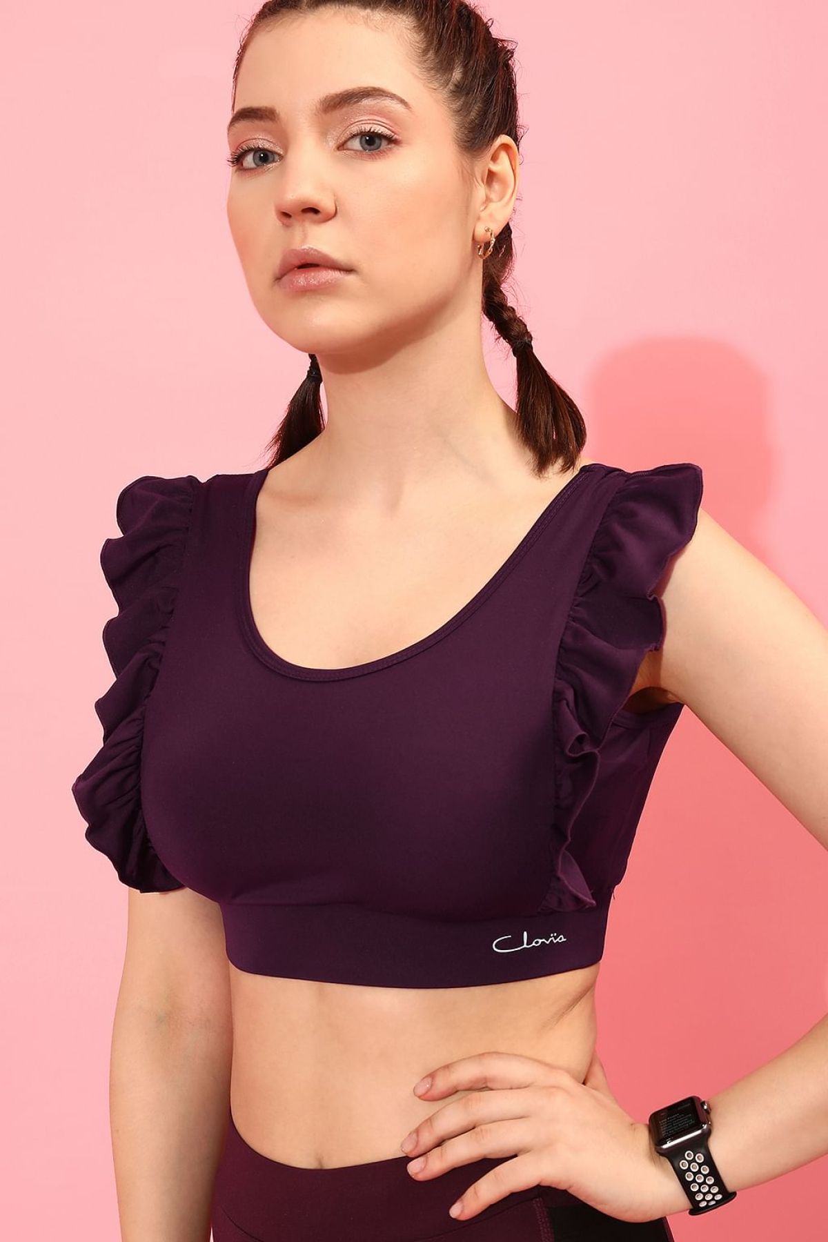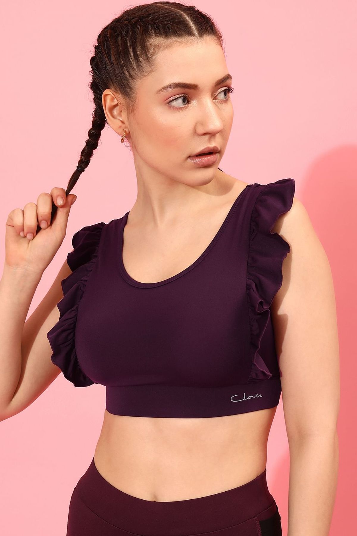 *Check the latest price and availability on the official store.Medium Impact Ruffled Padded Active Sports Bra in Plum Colour