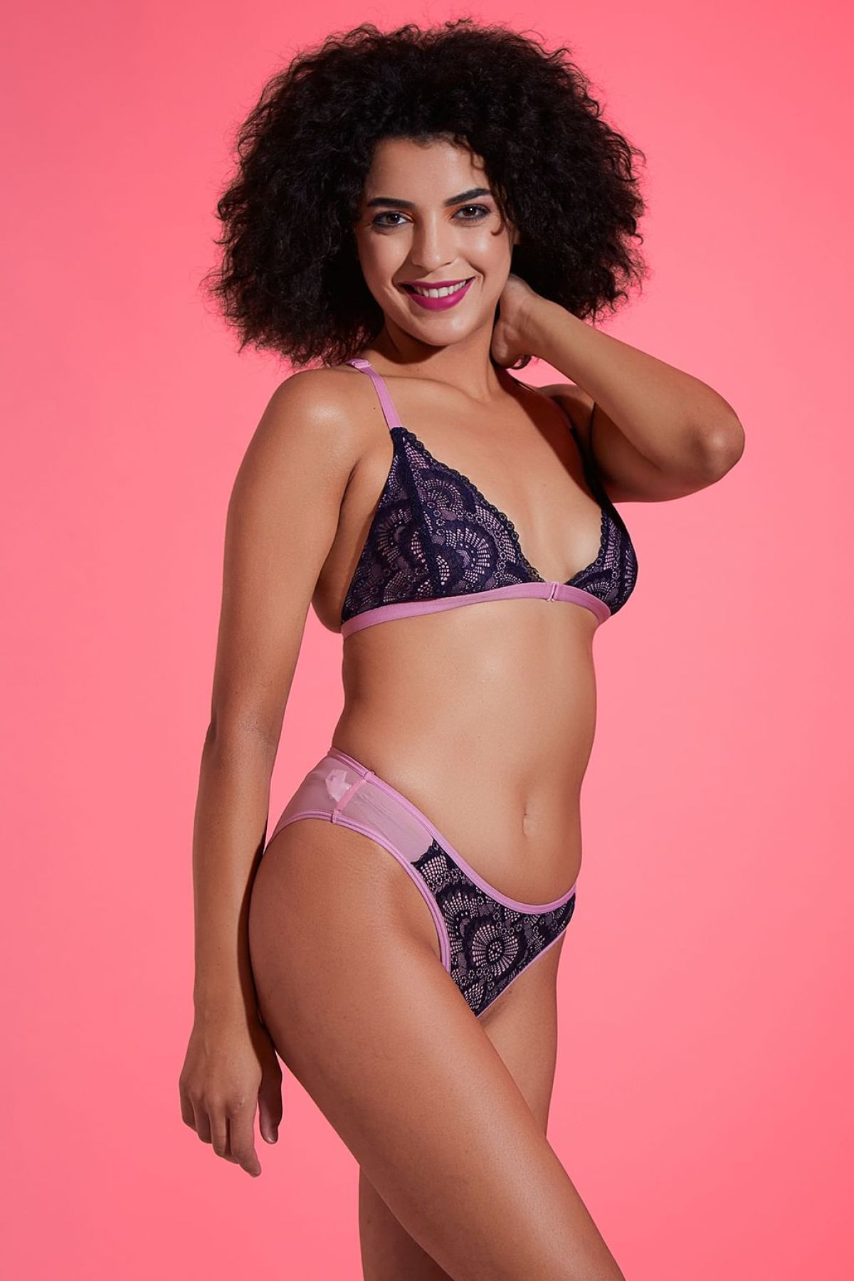 - Soft pink plunge bralette & low waist bikini panty set.