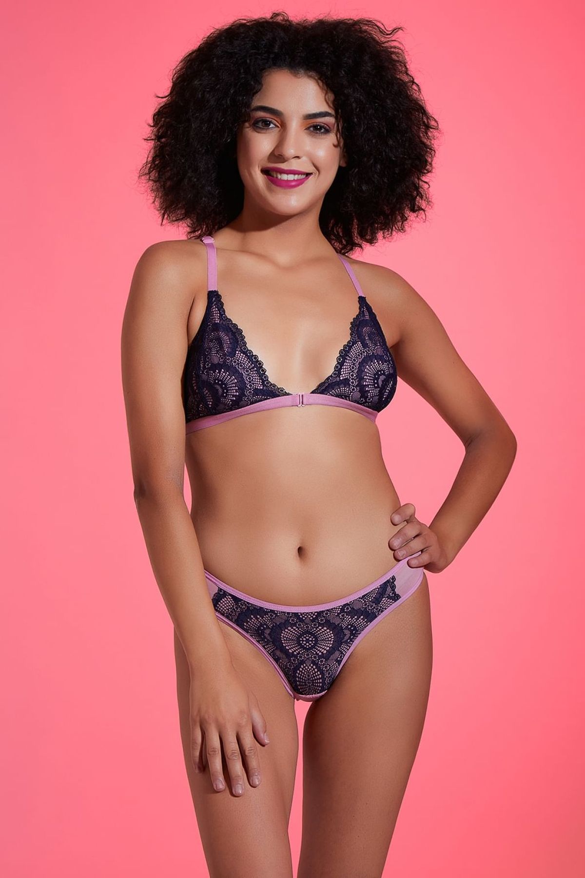 Non-Padded Non-Wired Demi Cup Front Open Bralette & Low Waist Bikini Panty with Lace Insert