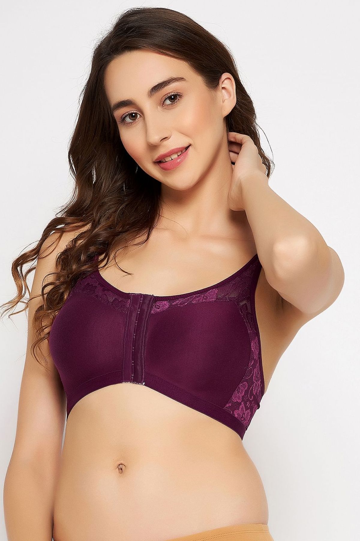 *Check the latest price and availability on the official store.Non-Wired Lightly Padded Spacer Cup Easy-On Full Figure Front Open Bra in Wine Colour - Cotton Rich
