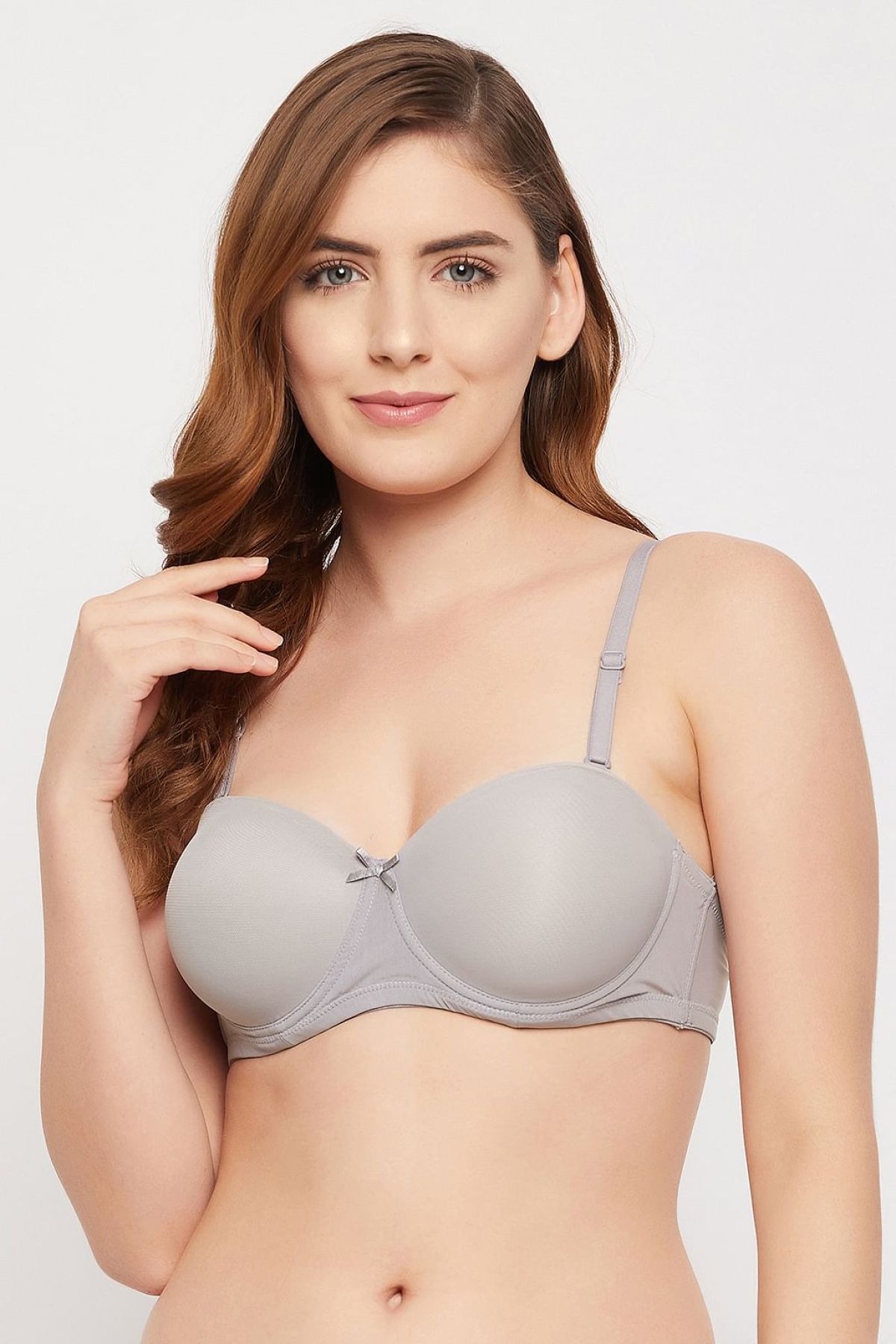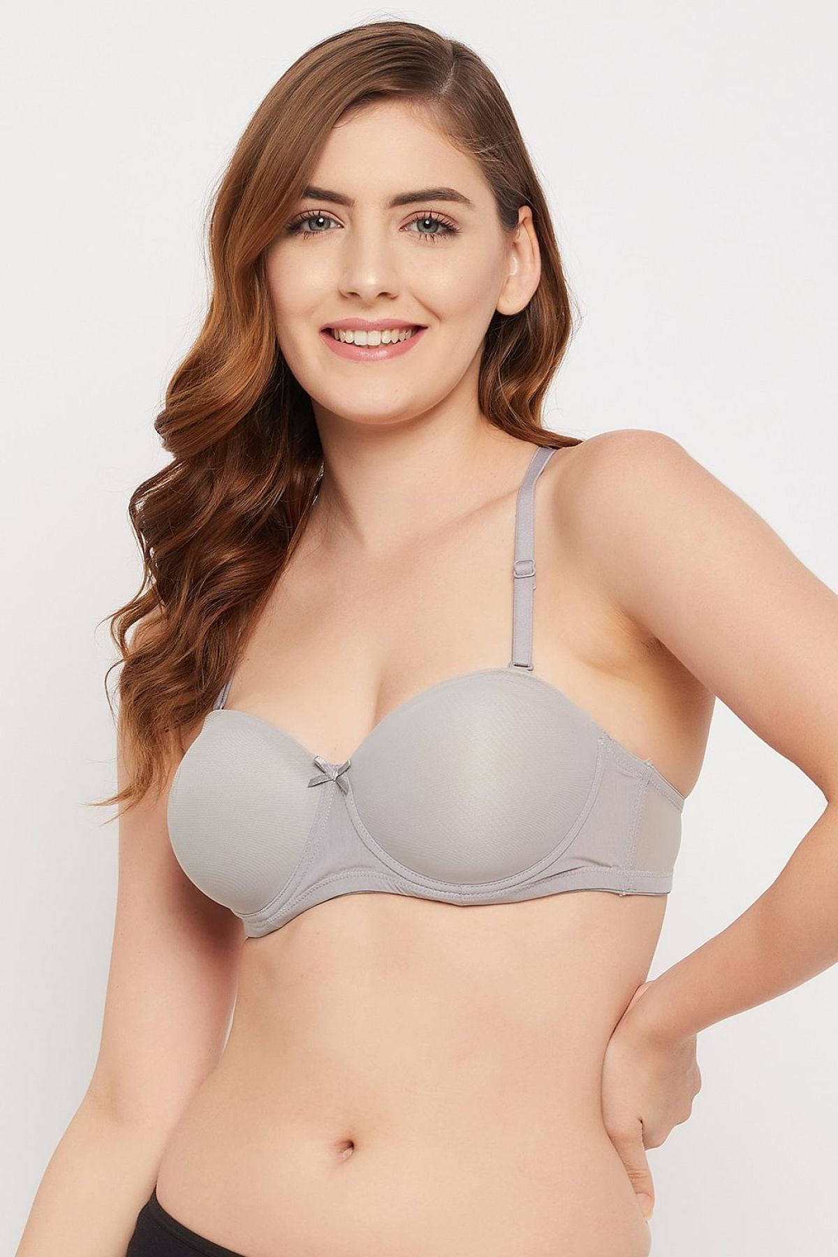 - Light grey strapless balconette bra crafted with soft powernet fabric.