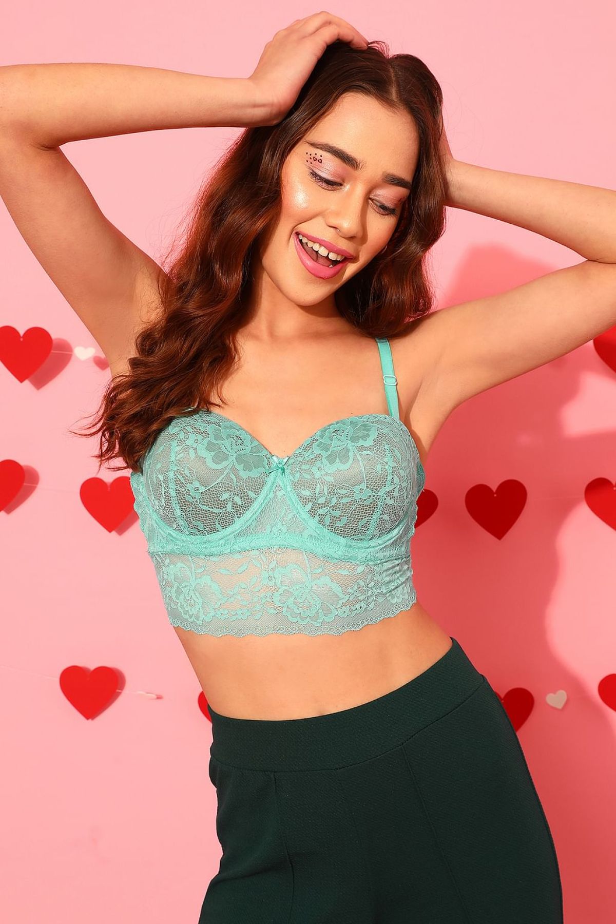 - Turquoise blue longline bralette with padded cups to protect modesty.