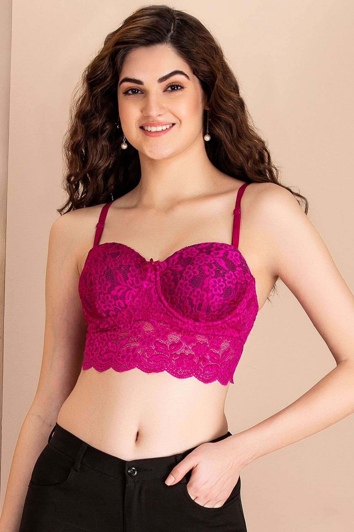 - Dark pink bralette crafted with exquisite lace and powernet fabric.