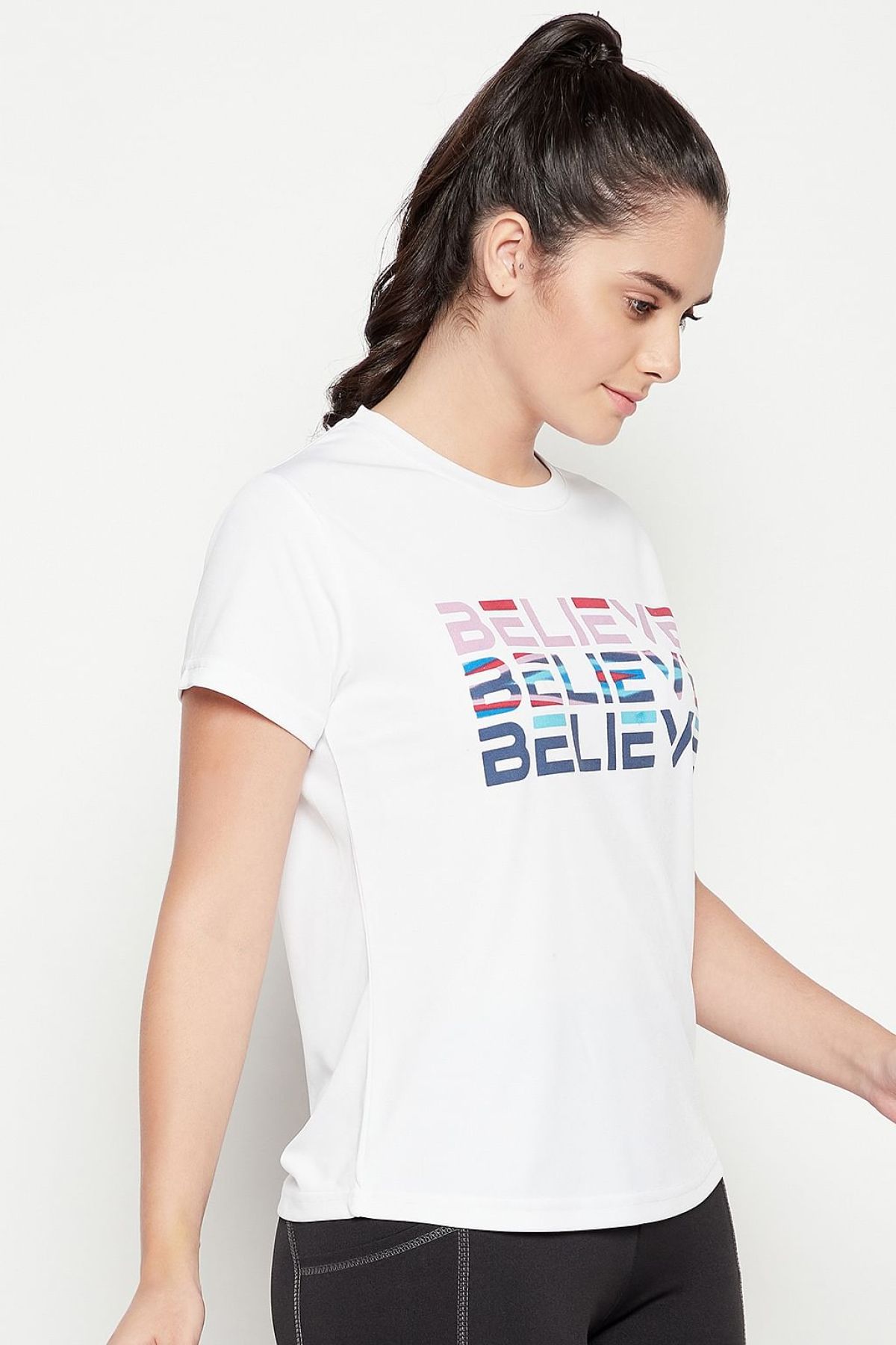 - Has a "believe" text print at the front.