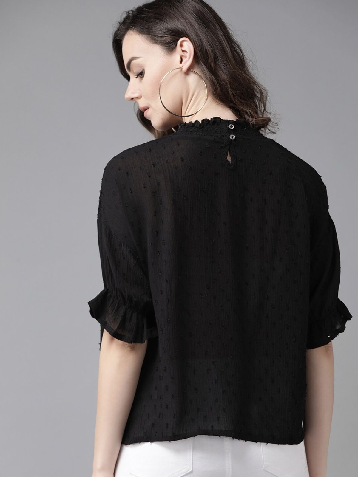 Black self-design woven regular top, has a high neck, short sleeves, and button closure