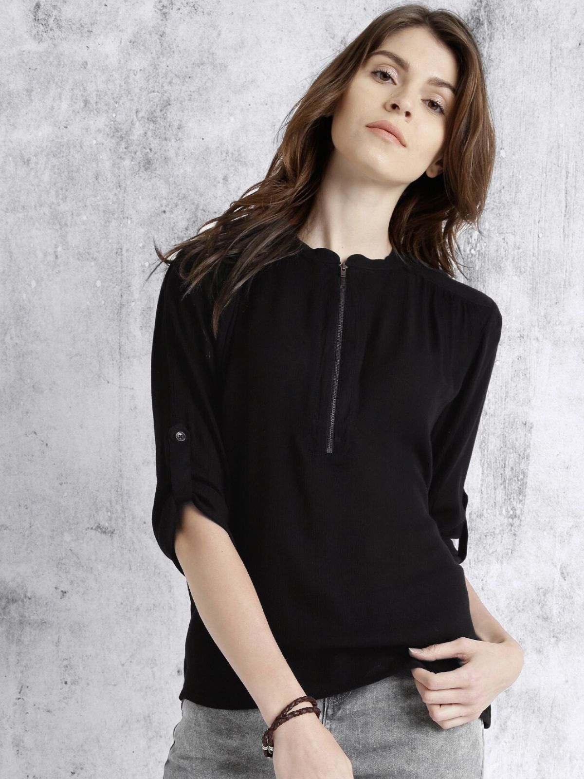 Black solid top, has a mandarin collar, a short zip closure, three-quarter sleeves with roll-up tab features, curved hem