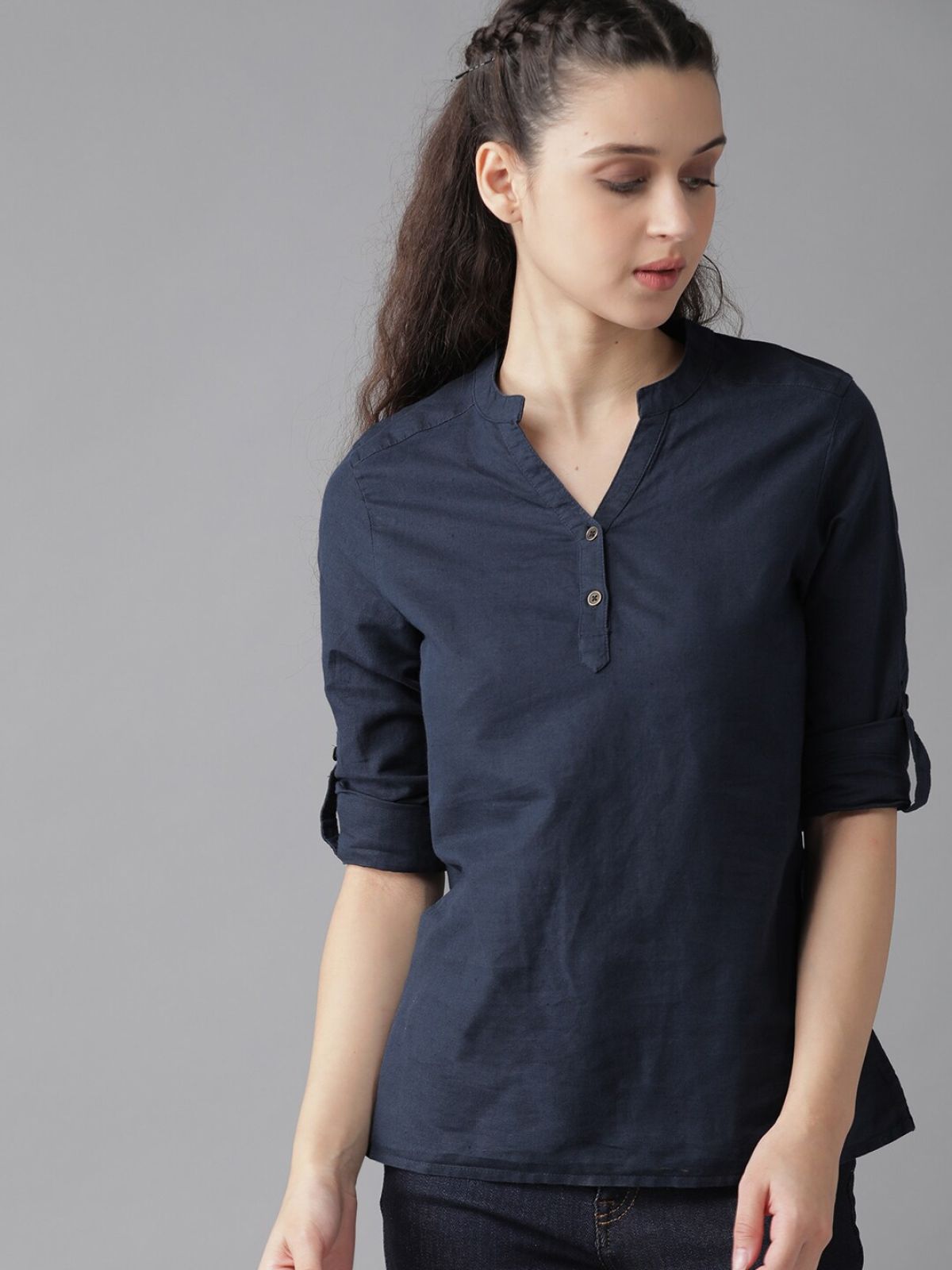 *Check the latest price and availability on the official store.Roadster Navy Blue Solid Mandarin Collar Roll-Up Sleeves Shirt Style Top