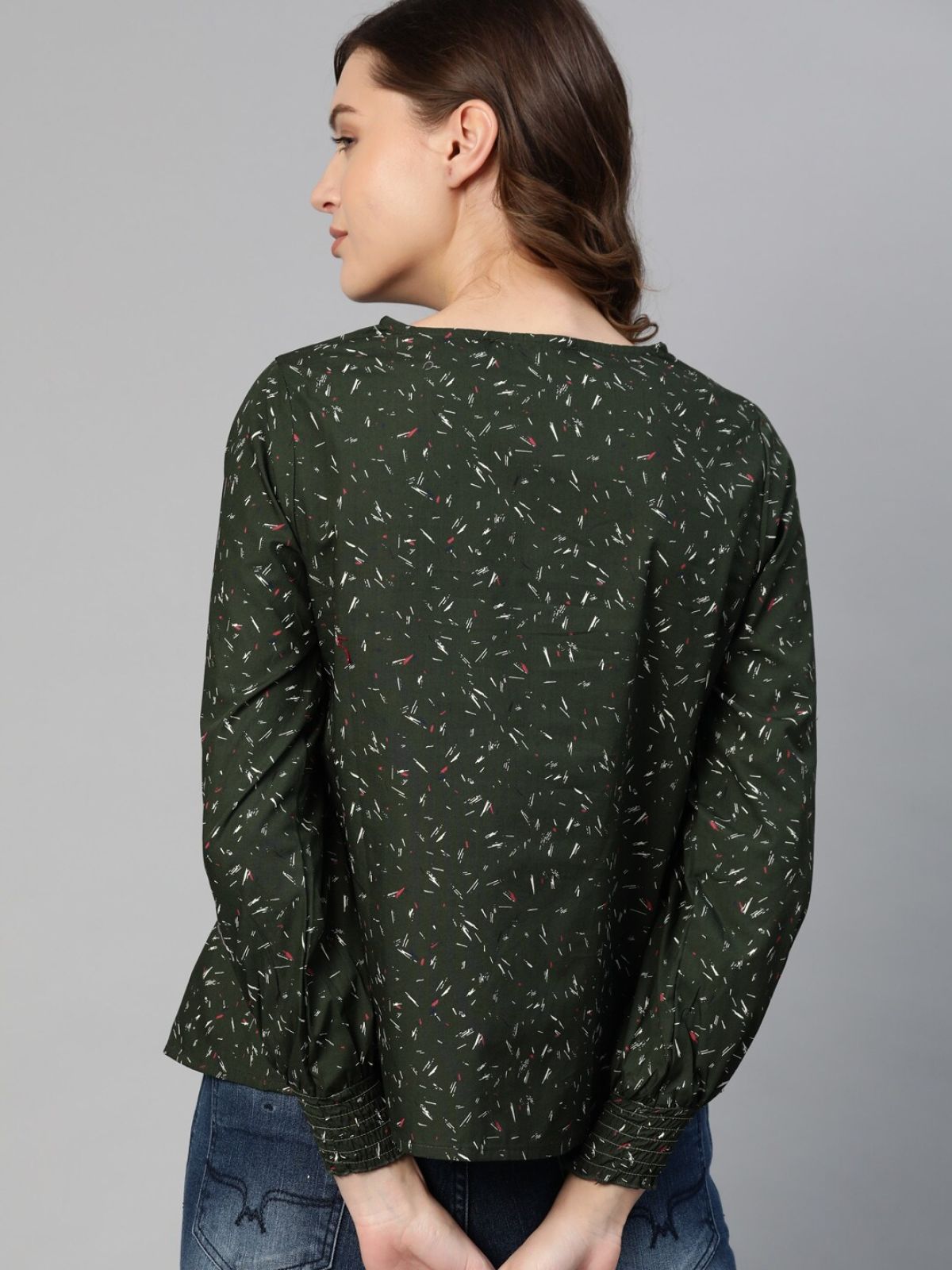 *Check the latest price and availability on the official store.Roadster The Lifestyle Co Olive Green & White Geometric Pure Cotton Pintucks Puff Sleeve A-Line Sustainable Top