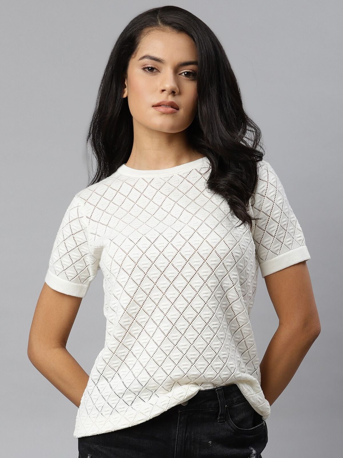 *Check the latest price and availability on the official store.Roadster The Lifestyle Co Women Crochet Knit White Pure Cotton Geometric Regular Top