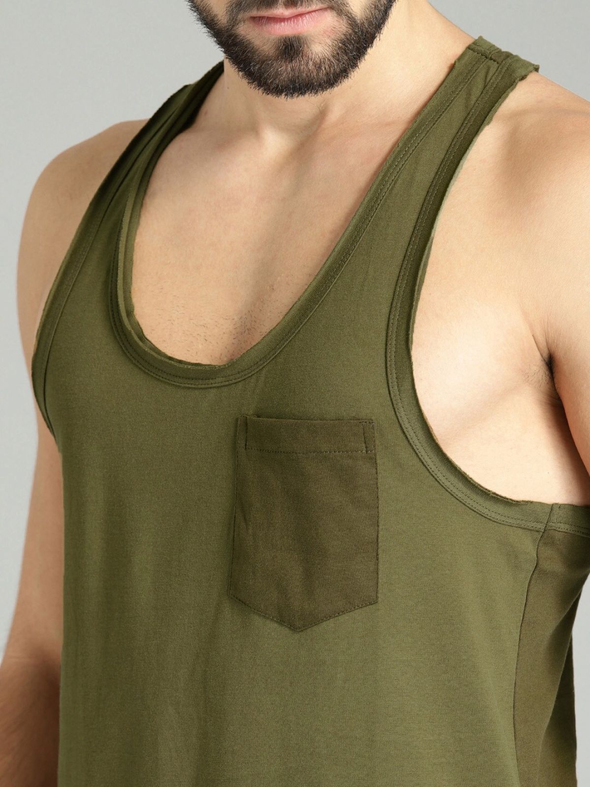 Olive \green solid T-shirt, has a round neck, sleeveless, 1 pocket