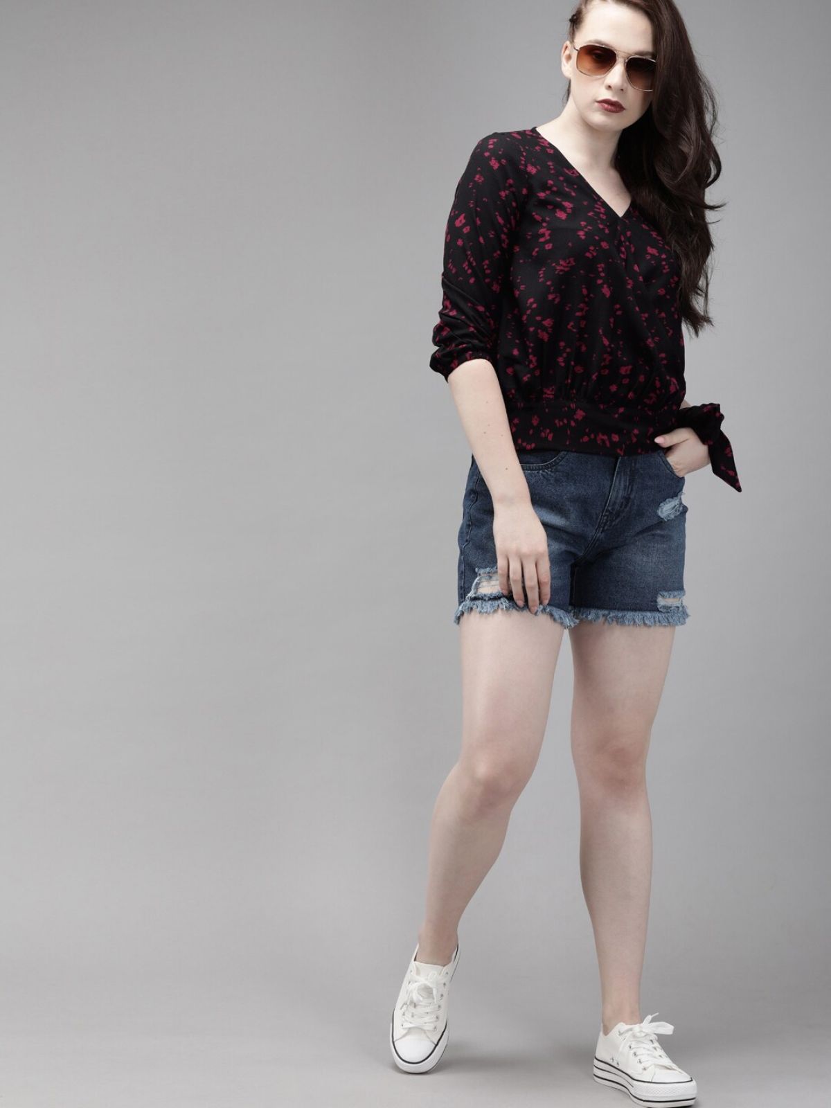 *Check the latest price and availability on the official store.Roadster Women Black Abstract Printed Waist Tie-Up Knitted Wrap Top