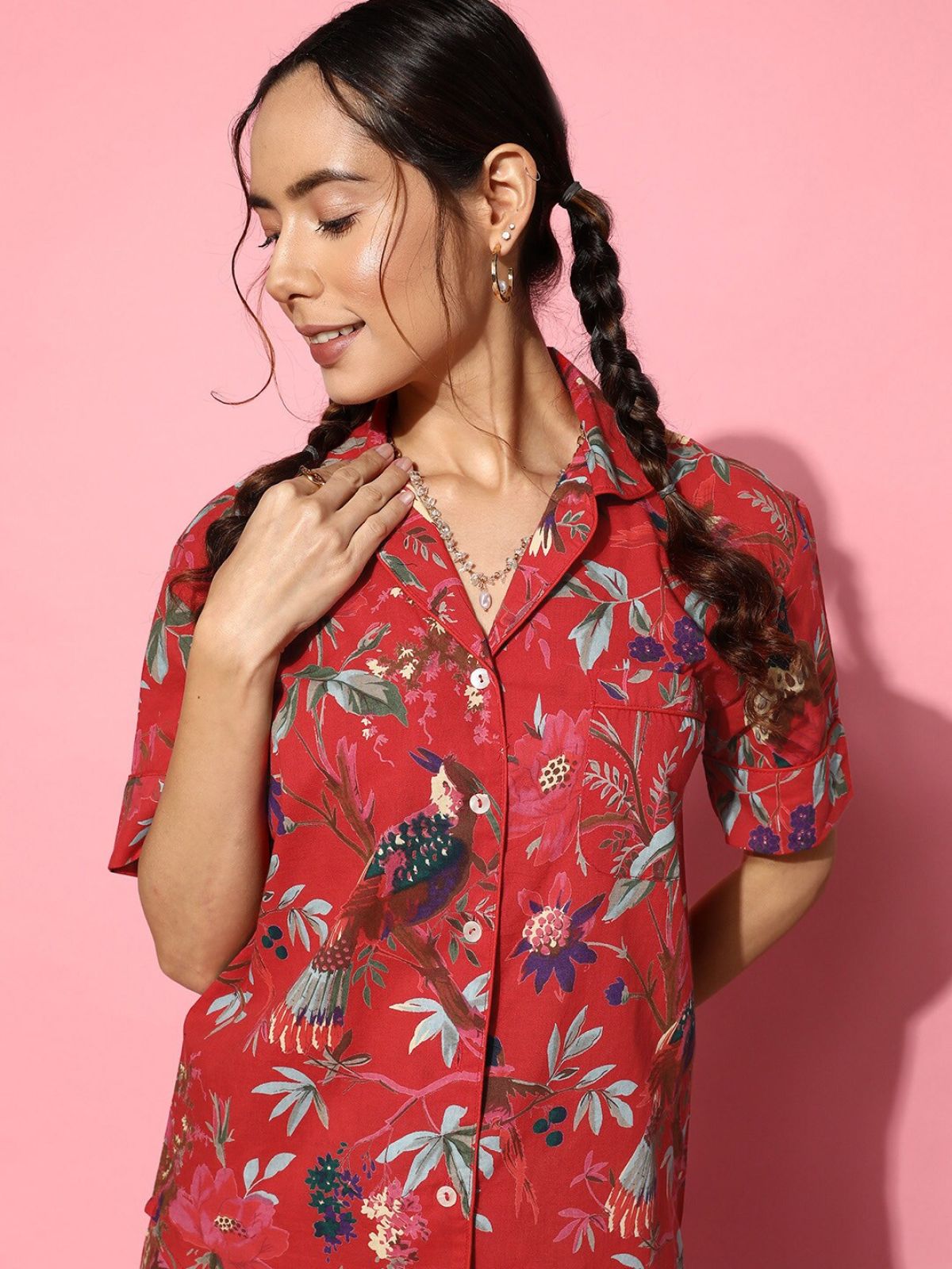 SANSKRUTIHOMES Women Red & Multicoloured Printed Pure Cotton Night Suit