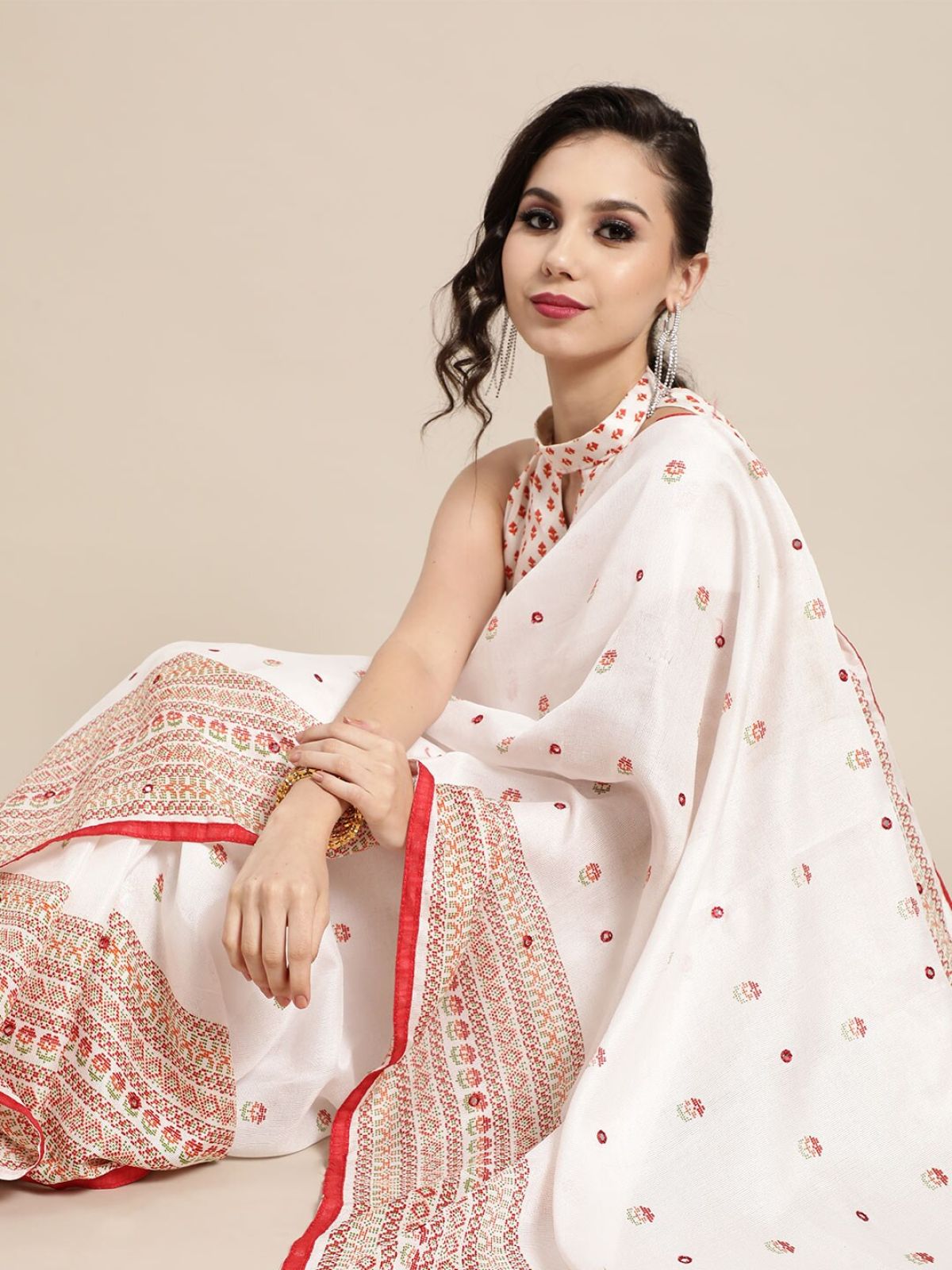 - Drape this stylish saree for a traditional yet chic look. Featuring an ethnic print and a solid border, it will add charm to your appearance.