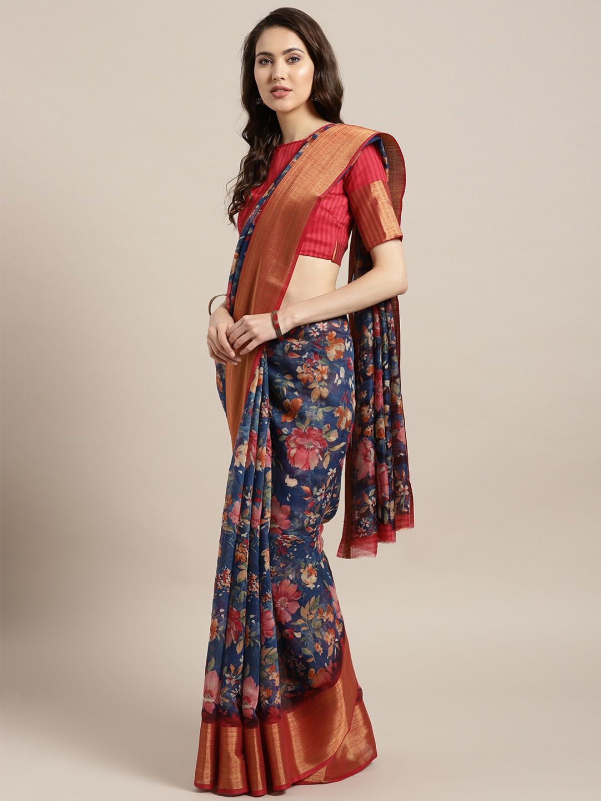 Saree mall Navy Blue & Red Linen Blend Printed Saree