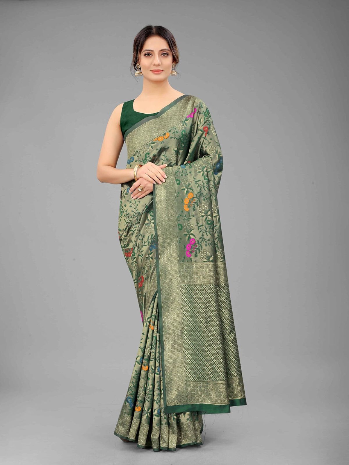 Silk Land Green & Gold-Toned Floral Pure Silk Banarasi Saree