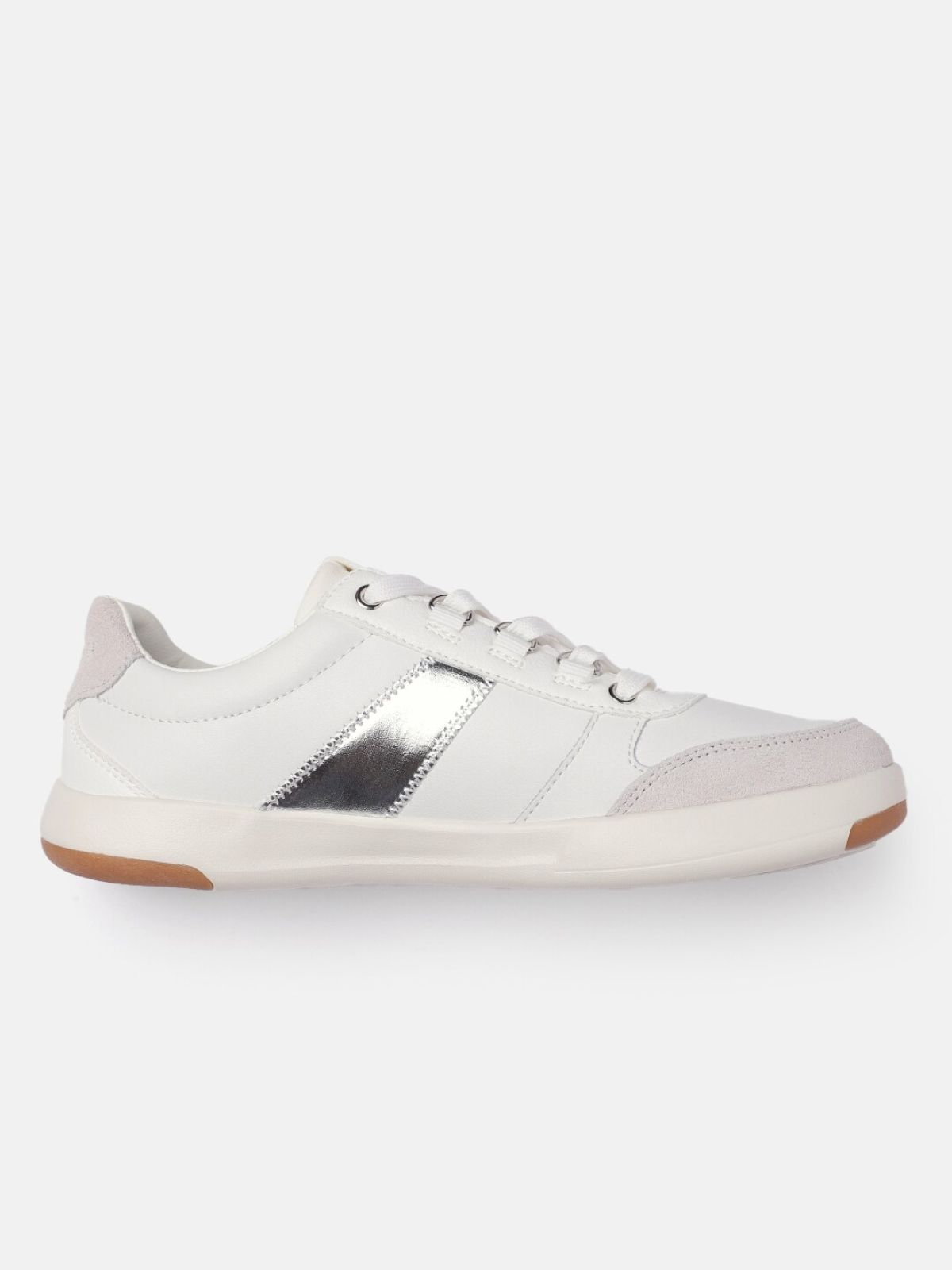 - A pair of round toe white solid sneakers, has regular styling,